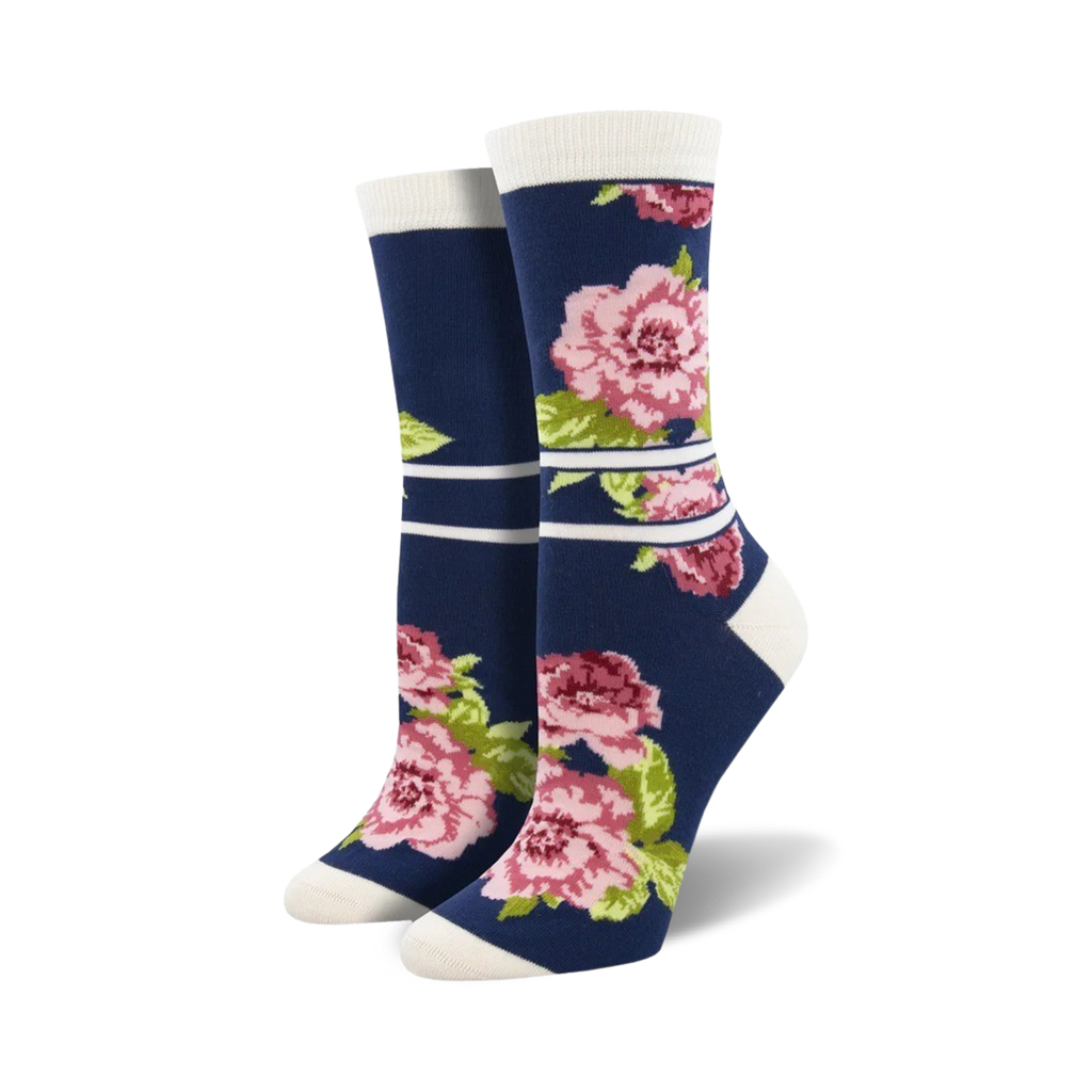 These Peonies If You Please Bamboo Crew Socks for Women are a vision of flowery glory. With a pattern of hot pink peonies with fresh green leaves standing out against a dark blue background and topped off with two light blue stripes, these floral socks are sure to make a statement whether you're rocking them casually or dressing to the nines. Fun fact: Did you know the peony is one of the few plants to bloom with a black flower?