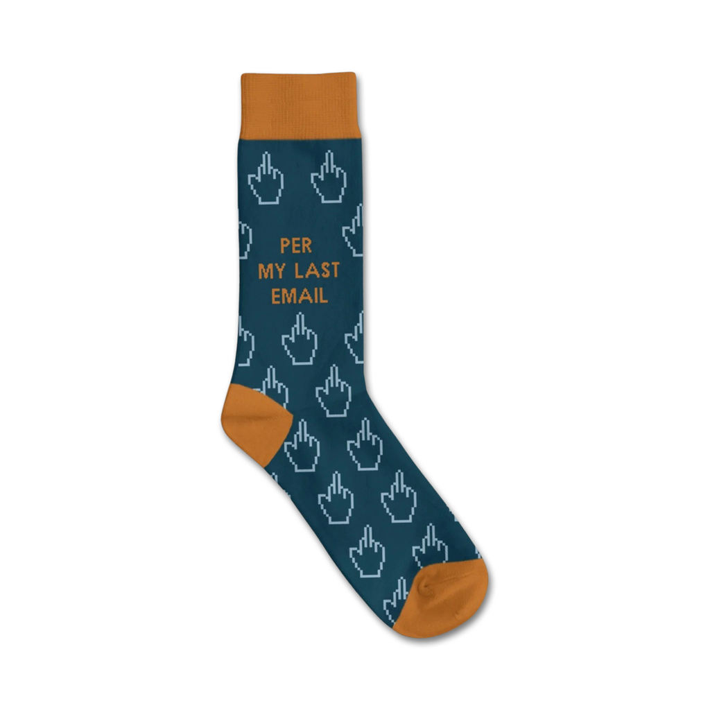Socks that will make you flip! These crew-length socks for men feature a pattern of middle fingers in various shades of blue on a dark blue background. At the top, you'll find the words "Per My Last Email" in bright orange, poking fun at all those office emails. So next time you're tempted to send a strongly worded message, reach for these socks instead. Who knows, they might just help you keep your cool.