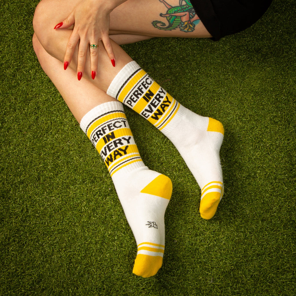 Strut your stuff in our Perfect In Every Way socks! These white socks with yellow stripes and bold black and yellow text will have you walking on sunshine. With a Crew length, these socks are perfect for feet of all sizes, and the fun and funny design is sure to bring a smile to your face and everyone else's. Perfect for men and women, these socks will make you the center of attention wherever you go!