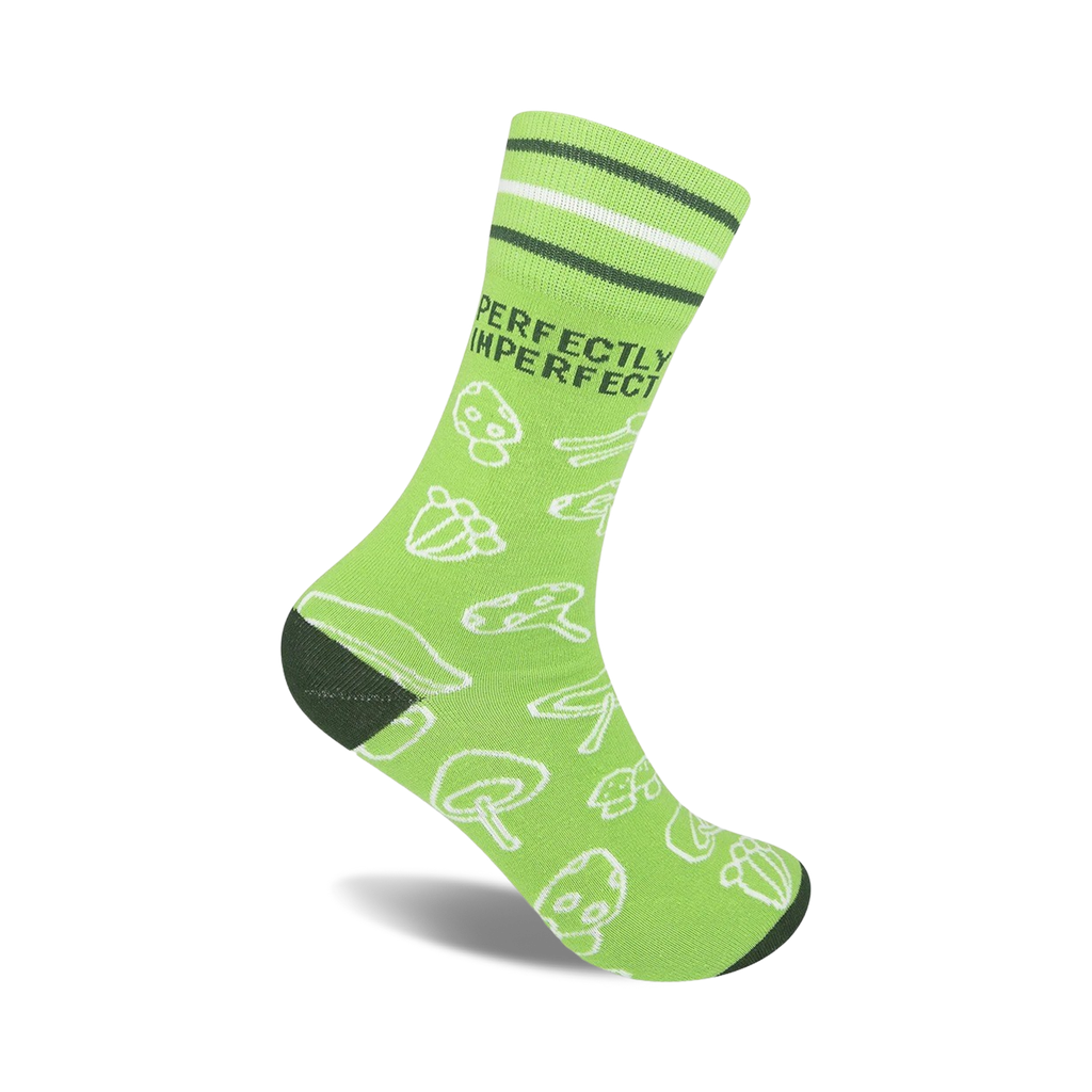 Perfectly Imperfect Veggie Socks : Garden vibes in your kicks! A quirky veggie garden in your socks will ensure your feet have all the fun while embodying the charm of fresh vegetables. With a green base, white toe, heel, and cuff, the socks are made of a soft and comfortable material and showcase a whimsical pattern of mushrooms, carrots, and a text that reads, "Perfectly Imperfect". Keep your vegetable garden inspired style right at your feet!