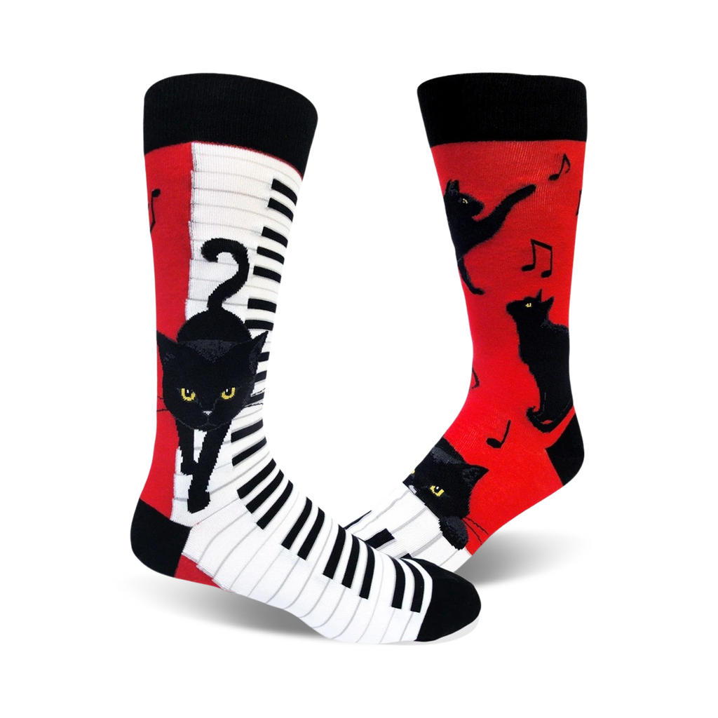 Introducing Piano Cat socks, the purr-fect accessory for music-loving cat enthusiasts. These crew socks feature a delightful pattern of black cats tickling the ivories on a piano keyboard. Made in a striking black, red, and white color scheme, these socks are sure to add a touch of whimsy to any outfit. Let your feet take center stage with these playful socks, perfect for casual wear or as a conversation starter.