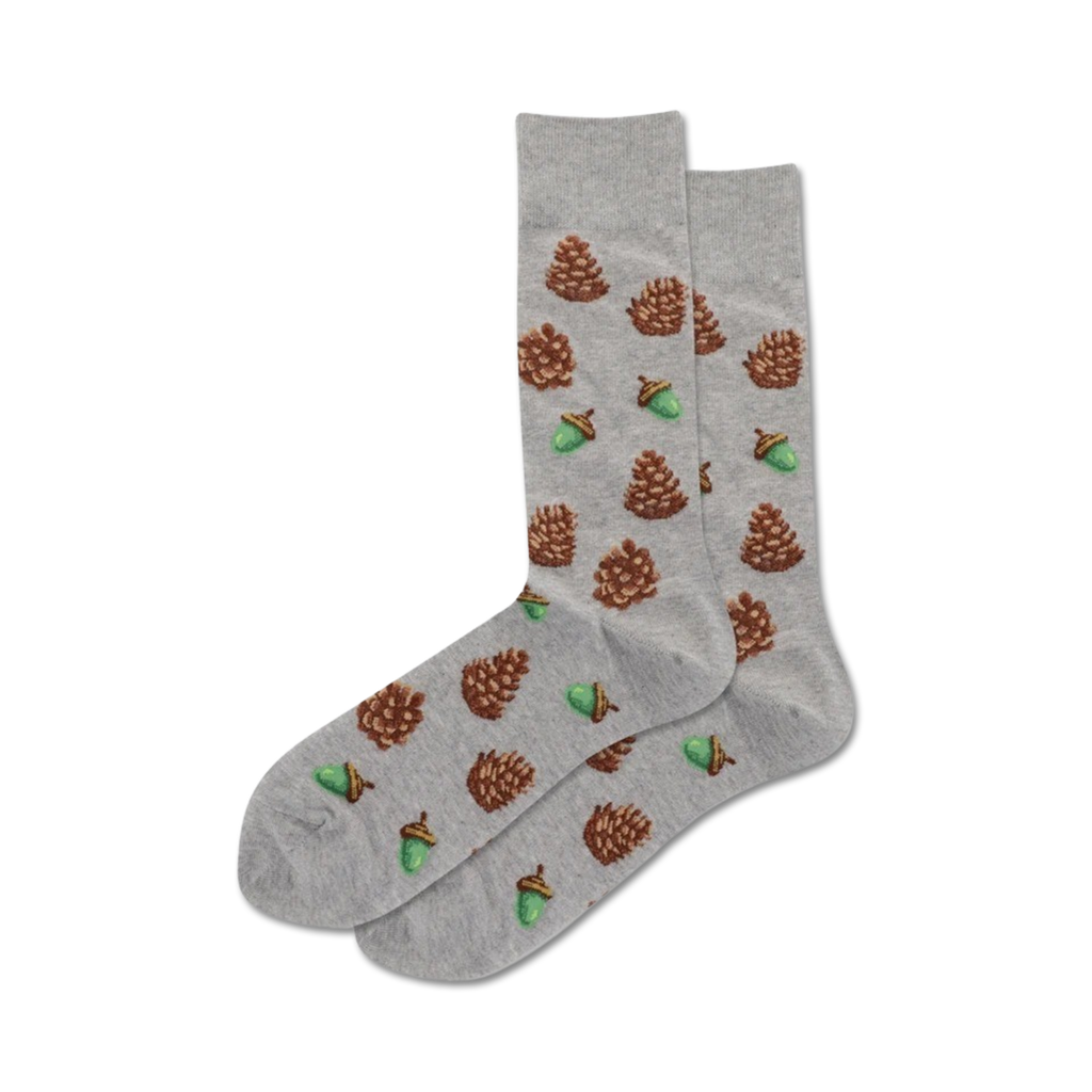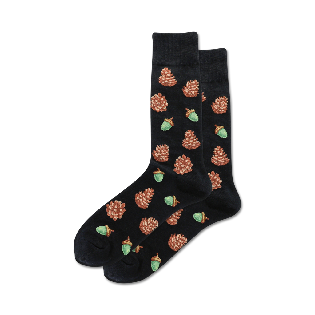 Why wear the same old boring socks when you can express your wild side with our Pine Cone socks? These black, crew-length socks are covered in a pattern of pine cones and acorns, perfect for anyone who loves the outdoors or just wants to add a little fun to their wardrobe. Plus, they're made for men, so you know they'll fit just right. Fun fact: did you know that pine cones are actually the reproductive organs of pine trees? So, next time you wear these socks, you can proudly proclaim that you are the ultimate tree-hugger.