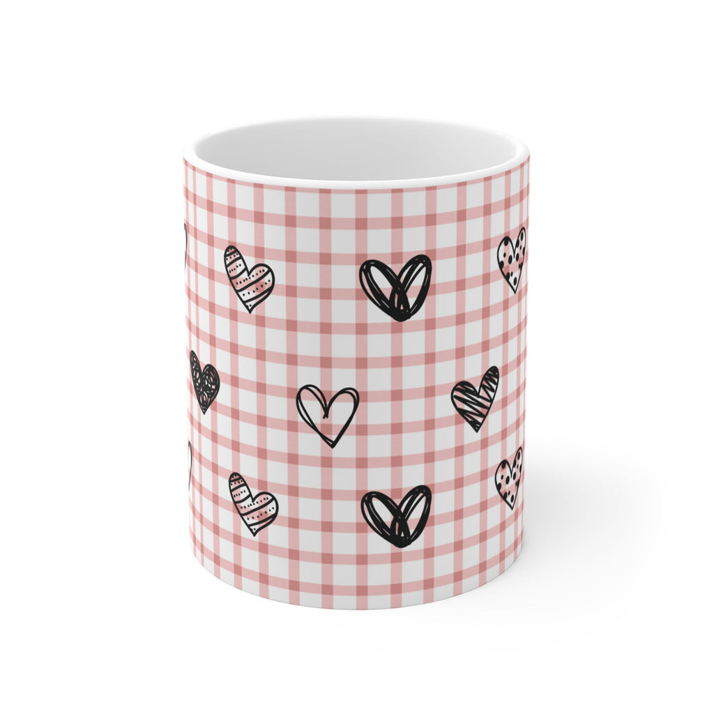 Plaid and Hearts Pink Mug - the perfect companion for your morning cup of coffee, tea or hot chocolate. Crafted from high-quality, durable ceramic, this classic white mug is designed to withstand daily use and is sure to become your go-to mug for all your favorite hot beverages. With its sleek and stylish design, this mug is perfect for both home and office use.