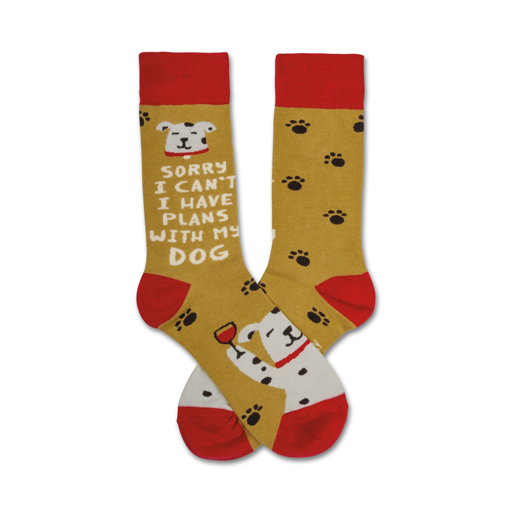 Who let the dogs out? These mustard-colored "Plans with my Dog" socks with red toes, heels, and a black-nosed, one-black-eared, one-white-eared cartoon dog wearing a red collar with a white circle on it and holding a wine glass in its mouth. But you don't have to check the couch, because it says right on the socks, "Sorry, I can't, I have plans with my dog." You'll love these crew length socks for women adorned with cute brown paw prints all over!