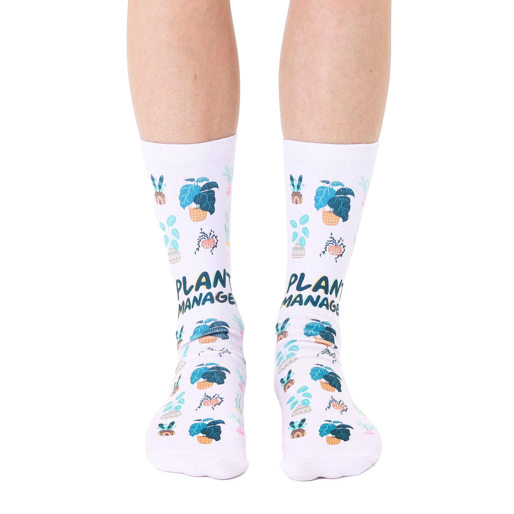 Who said plants are boring? With these vivid, quirky 'Plant Manager' socks you'll look so fly, your plants will be green with envy! These crew-length showstoppers feature a botanical beaut of green and blue plants, plus a front-and-center title that says "Plant Manager" in bold, black letters. Perfect for green thumbs, these socks will have you tending to your garden in style and comfort.