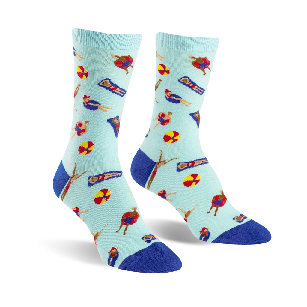 These womens blue crew socks got a wild pool party going on. With people swimming, lounging on colorful pool floats, and beach balls bouncin' around; a perfect way to bring the summer vibes wherever you go! You'll be the coolest cat by the pool in these socks, no cap. Wave over to your friends, grab a floatie, and jump in!