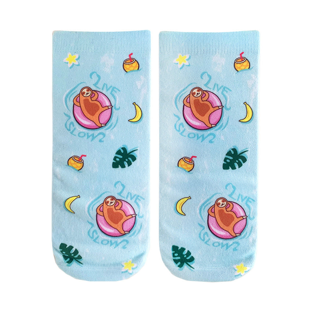 Pool Sloth socks are the epitome of relaxation and good vibes. Picture this: turquoise water, chill sloths floating on inner tubes, sunglasses, bananas, palm leaves, and coconut drinks. It's like a tropical vacation on your feet. Plus, these bad boys are made just for the ladies, so slip in and let the sloth vibes take you away.
