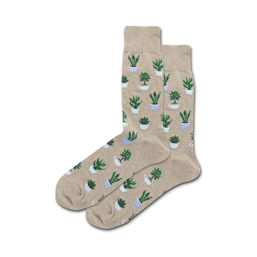 Potted Succulents - Crew Socks Men's - Beige: Get your garden on without getting your hands dirty! These beige novelty socks feature an array of vibrant green, white, and brown potted succulents. Blue, gray, and white ceramic pots and saucers complete this adorable design. These crew socks will let everyone know you're a green thumb at heart.