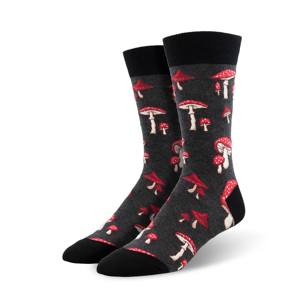Unleash your inner fun-guy with these Pretty Fly For A Fungi socks! Guaranteed to make you the life of the party or the mushroom in the compost pile. Be the fly agaric of the ball with these toadstool terrific socks. Featuring a vibrant pattern of red and white spotted mushrooms on a dark gray background, these crew socks are perfect for the man who likes to add a bit of whimsy to his wardrobe. Whether you're dressing up for a night on the town or just kicking back at home, these socks are sure to put a smile on your face.