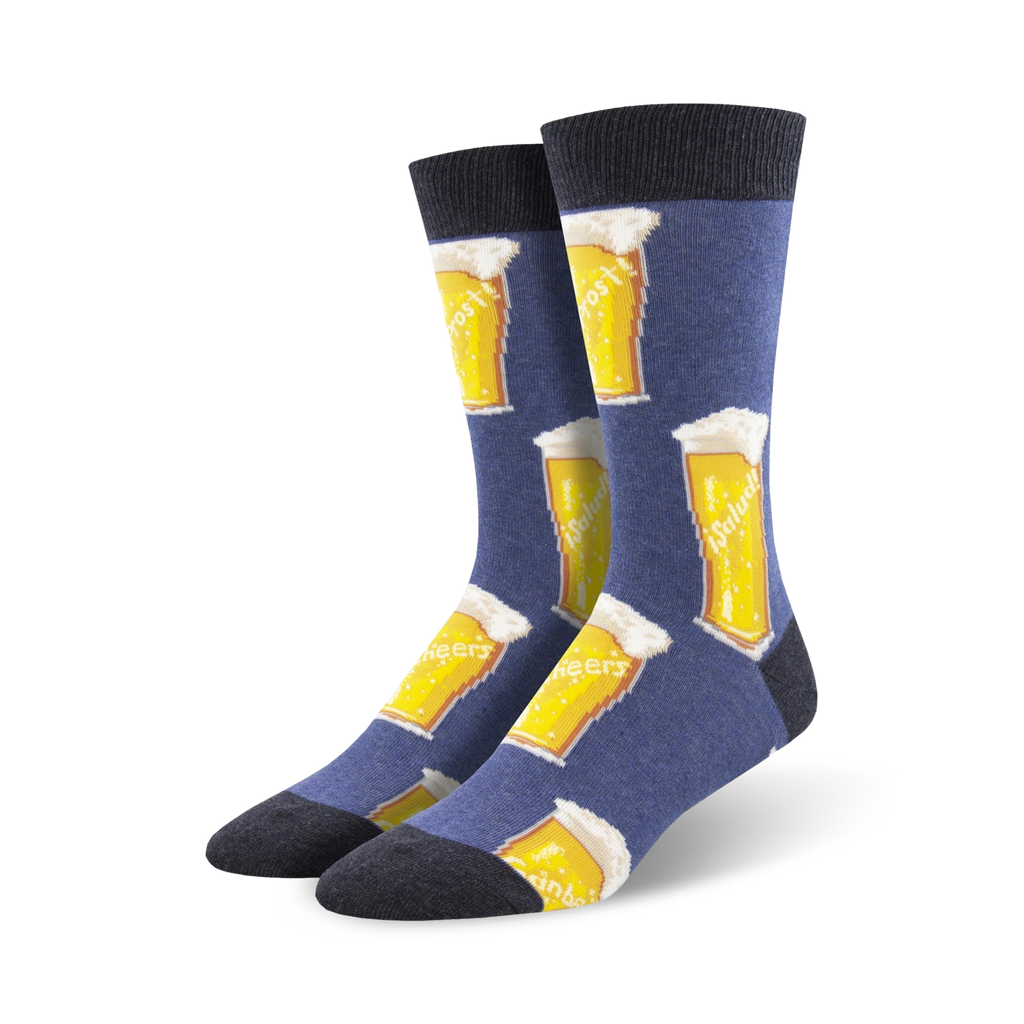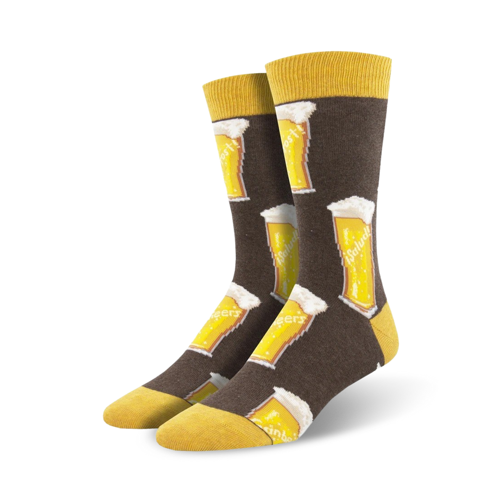 Ready to get foam-tastic? These Prost! beer mug socks are the perfect way to show your love for a cold one. With their brown background and bright yellow tops, these crew socks will have you feeling like you're sitting at your favorite bar, even if you're just at the office. And because they're made for men, you can be sure they'll fit just right. So grab a pair of these beer-utiful socks and get ready to raise a glass to your good taste in fashion!