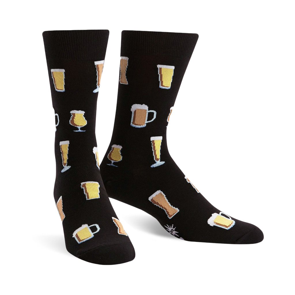 Feeling thirsty? Instead of heading to the fridge, slip on these Prost! beer socks and the party can start right on your feet! These black socks feature an allover pattern of frothy beer glasses and steins in brown, yellow, and white that will quench your thirst for style and make a statement in any situation. These fun and festive beer-themed socks are perfect for any beer lover and will be sure to get a reaction from anyone who sees them. Even if your friends don't want a beer, they will still think these socks deserve a round of applause. Wear them to a kegger, a brewery tour, the beach, or even to your next meeting (if you're feeling bold) and be sure to raise a glass to your amazing sense of style.