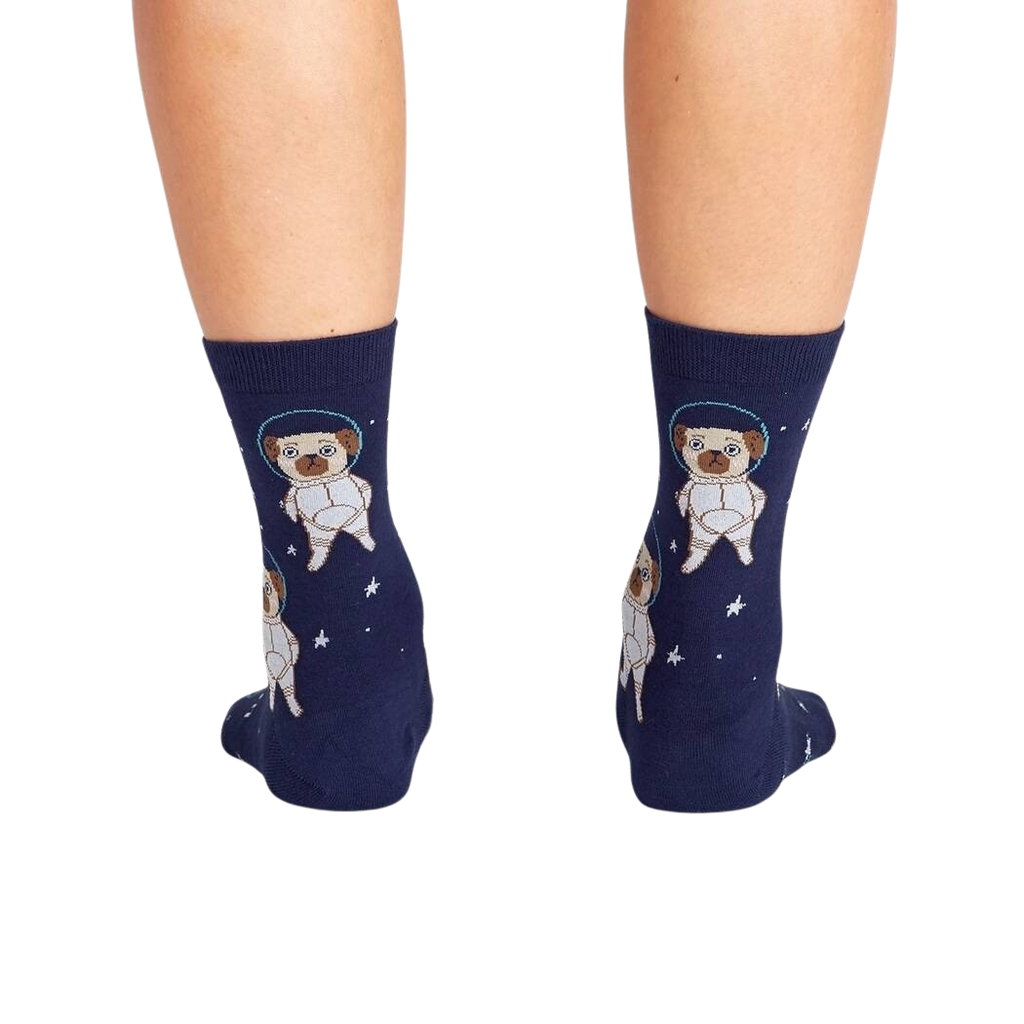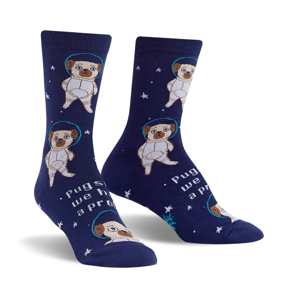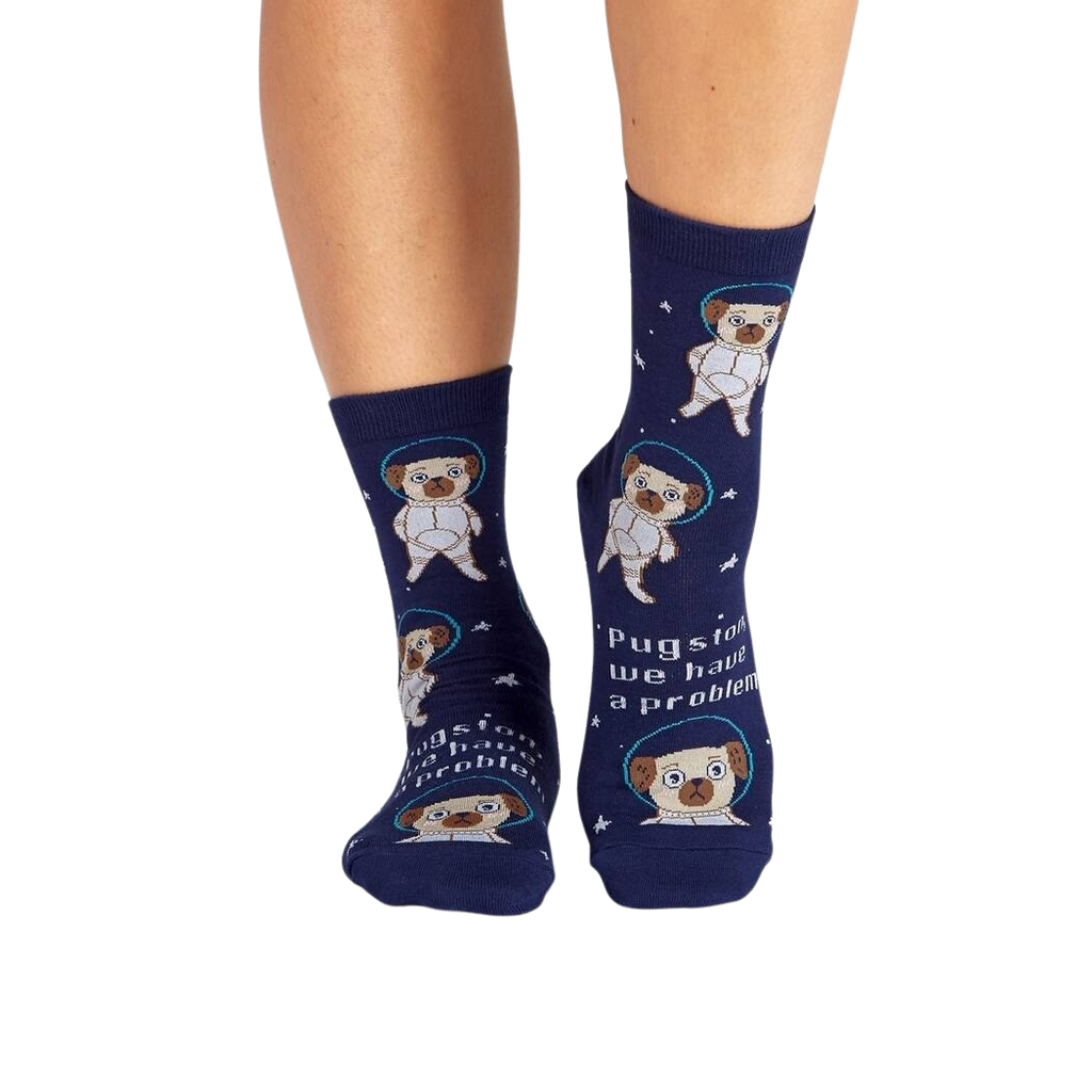 Blast off into a cosmic journey with our Pugston, We Have A Problem socks! Featuring a crew of cartoon pugs suited up in space gear, these socks are out of this world! Get ready to explore the great unknown with these fun and fashionable socks that'll make you smile every time you put them on.