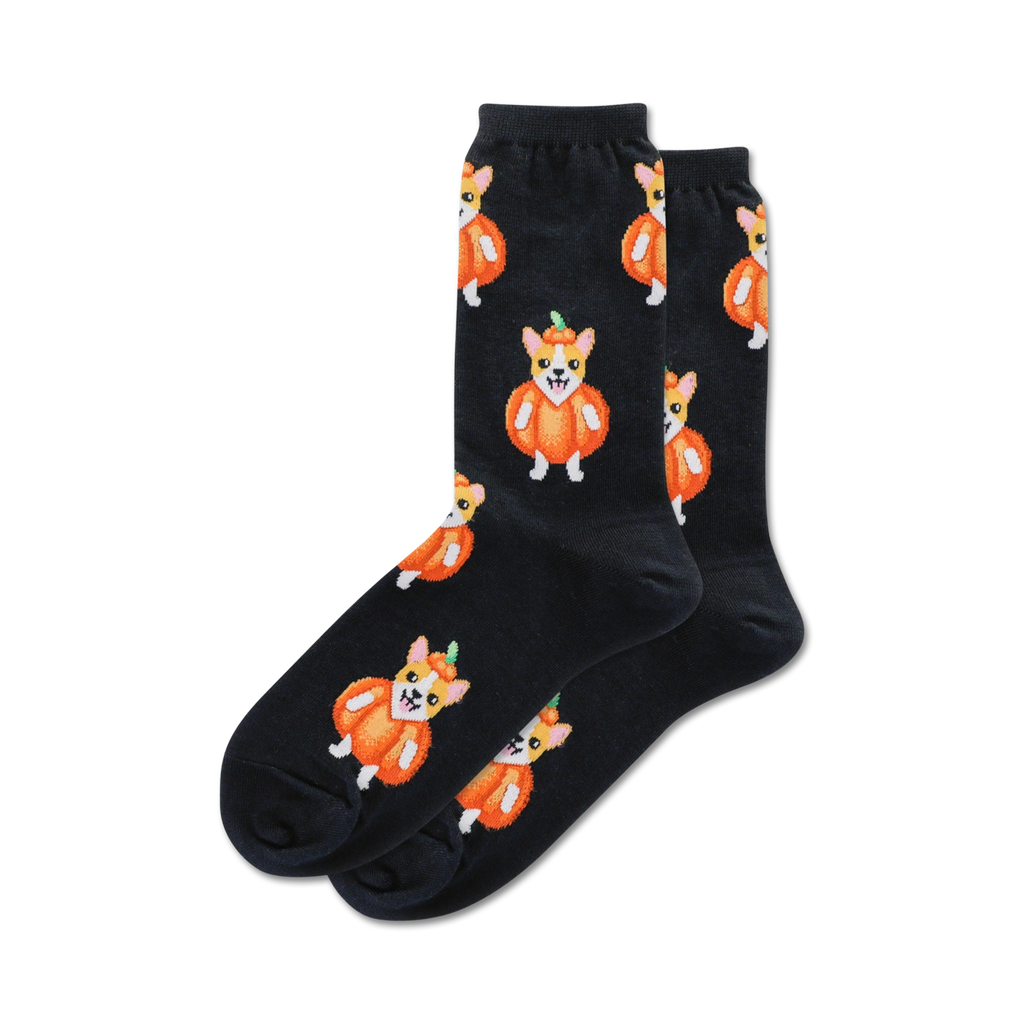 Prepare to get paw-some! Strut your stuff this Halloween in our Pumpkin Corgi socks, featuring a mischievous crew of cartoon corgis trick-or-treating in pumpkin costumes. These crew socks for women are a delightful mix of spooky and adorable. The black background makes the vibrant orange pumpkin costumes pop and adds a touch of festive flair to any outfit. So slip into a pair of these delightful corgi socks, grab your candy bucket, and get ready for a howling good time.