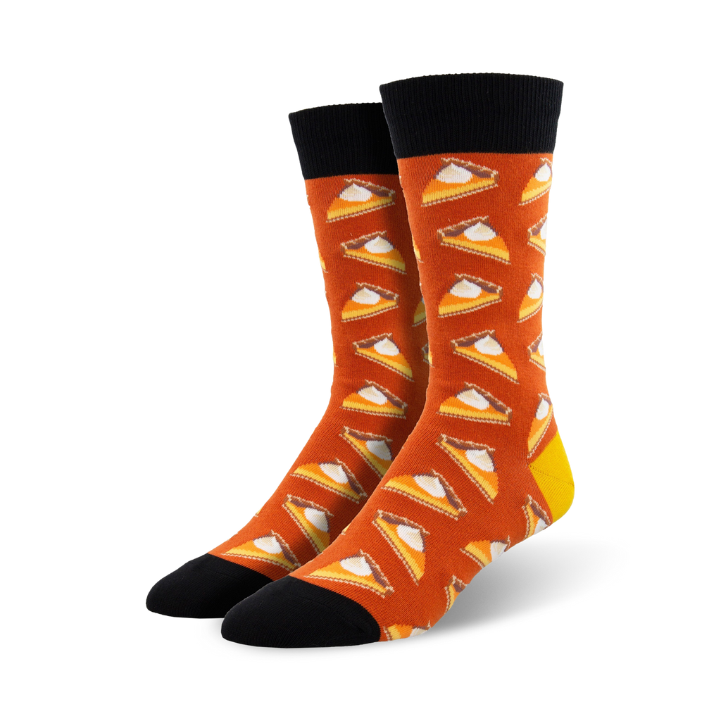 Do you want a pair of socks that will make you the talk of the Thanksgiving table? Look no further than our Pumpkin Pie socks! With their all-over pattern of cartoon pumpkin pies topped with whipped cream, these socks will definitely be a hit. They're made with a soft, comfortable blend of materials that will keep your feet happy all day long. And with their orange and black color scheme, they're perfect for showing off your Thanksgiving spirit.