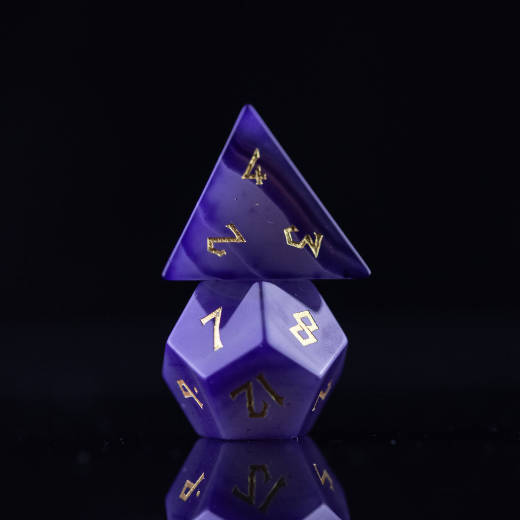 Purple is the color of nobility, and this dice set is befitting of royalty! Brilliant purple hues swirl amongst light and dark shades across the seven dice, with easy to read golden numbers doubling down on this set's regality. Truly, these are dice fit for a king or queen!