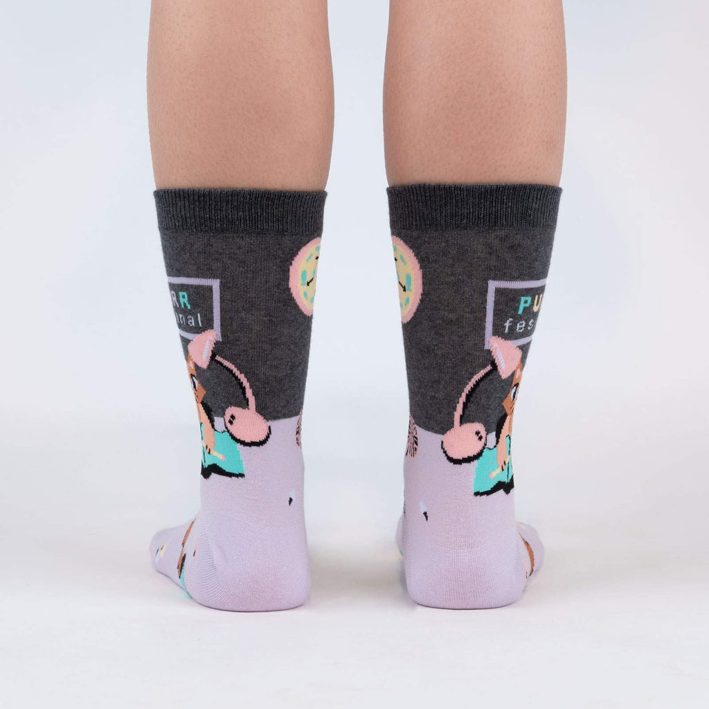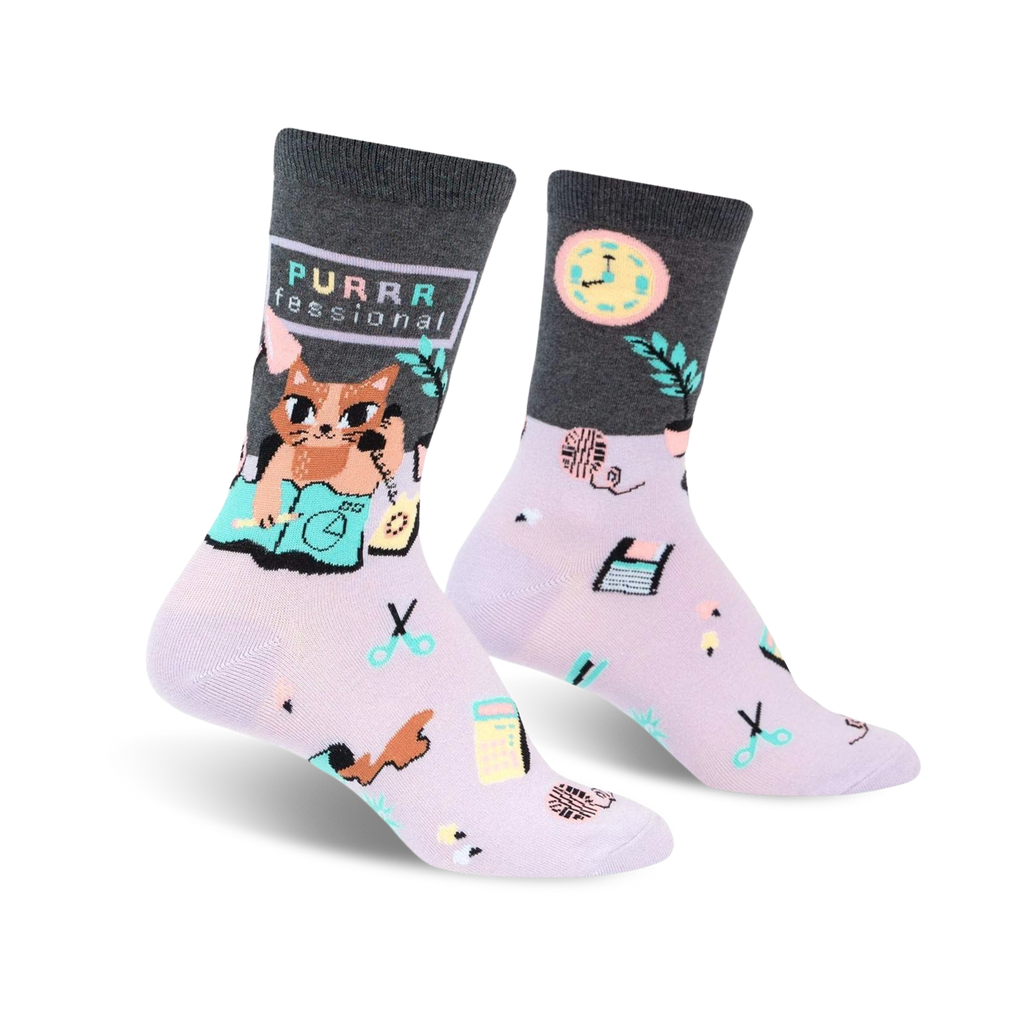 Presenting Purrrfessional, the most paw-some socks on the market! These crew length wonders will have you strutting like a top feline fashionista. Featuring a cartoon cat wearing spectacles and a snazzy pink bowtie, perched regally atop a heap of colorful books and clutching a retro-chic rotary phone, these socks are sure to be the cat's meow for any cat enthusiast. Adorned with whimsical images of yarn, scissors, a tape measure, and a clock, these socks are like a delightful storybook brought to life on your feet.