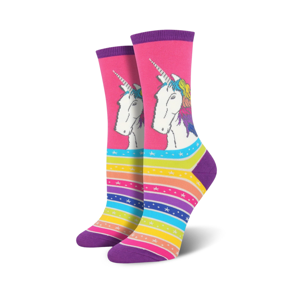 Shine bright like the amazing, mythical creatures that we know of as... unicorns! Unicorn lovers will appreciate the beauty of these majestic women's novelty crew socks. Each cool pair features a portrait of a unicorn printed against a pink background. There are colorful stripes and stars showcased too. Slip these on and let your feet experience the magic!