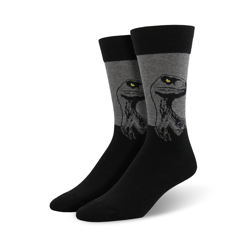 If you are a dinosaur lover, we'll have you raptor round our finger with these super cool socks! This pair of black and gray crew socks features a monochrome print of a raptor with a yellow eye showing. Dinosaurs may have went extinct, but there brought back to life with these socks.