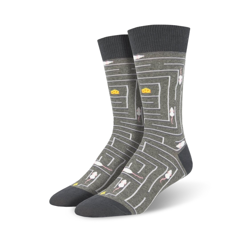 When you're feeling stuck in the rat race, put on these socks and let your mind wander through the maze. You'll be amazed at what you find! These gray crew socks feature a pattern of a maze, mice, and cheese. Perfect for men who love a little fun and whimsy.