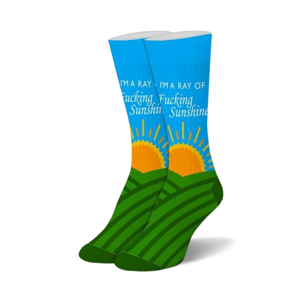 If your vibe is less "polite hello" and more "I bring my own damn light," these socks are for you. The top half is a vibrant blue, like a perfect clear sky, with a bold orange half-sun rising over green, striped hills below. Radiating yellow lines shoot out from the sun, giving off major positive energy. And right there, visible on the blue sky, is the clear message "I'M A RAY OF FUCKING SUNSHINE." It’s a direct, funny statement that perfectly captures that feeling of owning your bright, unfiltered personality. These socks are a fun, spirited way to show the world you're here to shine.