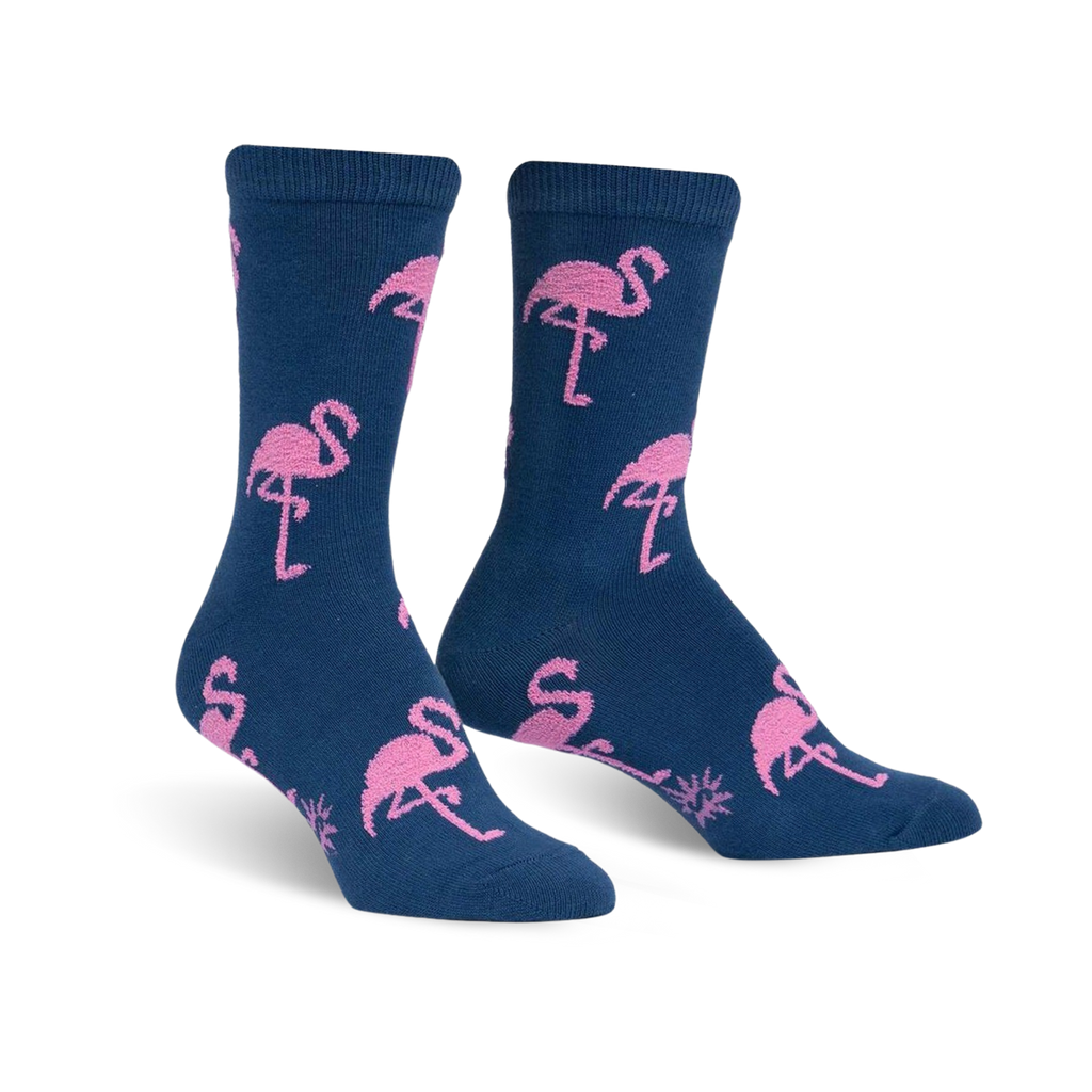 Ready-Set-Flamin-go! These striking, deep blue crew socks are printed with bright pink flamingos poised for a dash through the water or a jaunt across a lawn. Be the best-dressed at the pool party or just show the world your penchant for fun socks and all things flamingo!
