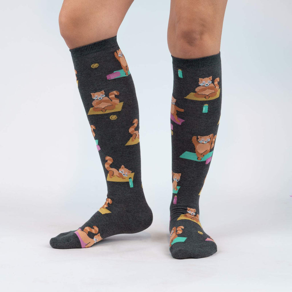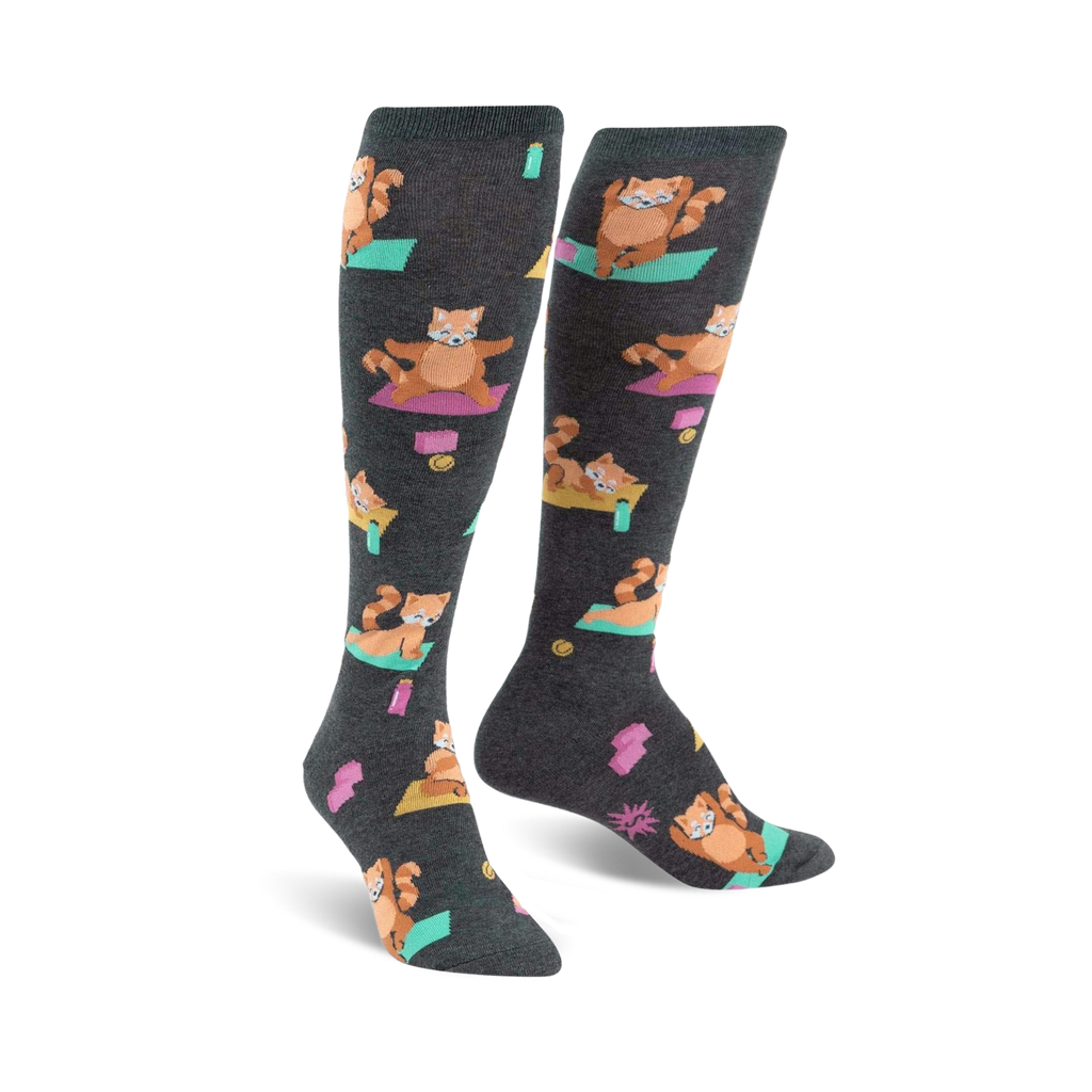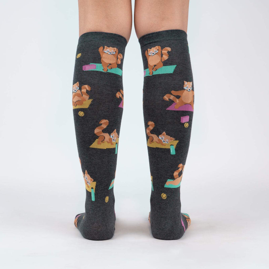 Get ready to strike a pose with the Red Panda Pose socks! These knee-high wonders for women feature a delightful pattern of red pandas practicing yoga in various poses, from downward-facing dog to tree pose. With these cuties on your feet, you'll channel your inner yogi and feel the zen wherever you go. Plus, the gray background with the yoga mat and "Namaste" symbol brings the whole theme together perfectly. Get ready to downward dog in style with the Red Panda Pose socks!