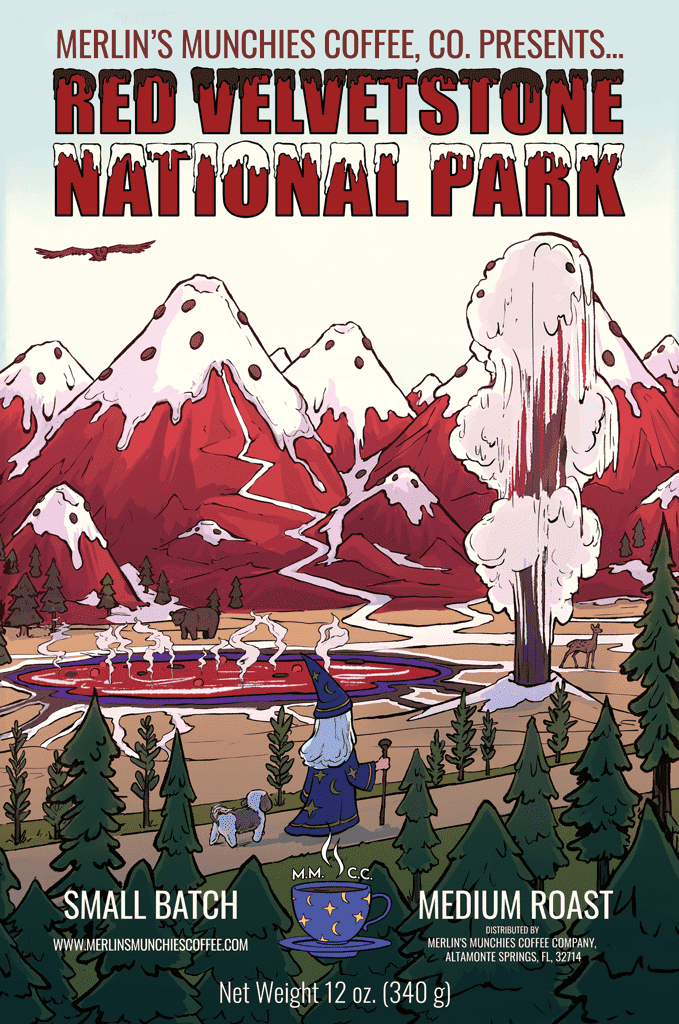 Merlin loves Yellowstone National Park, red velvet cake, and coffee so much that he decided to combine them. Welcome to Red Velvetstone National Park! Where the red velvet coffee flows like fine wine and satisfied wizards sleep under the stars. Its location is undisclosed, but you can experience red velvety magic in your cup anytime you wish!