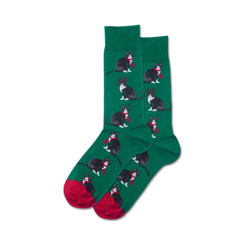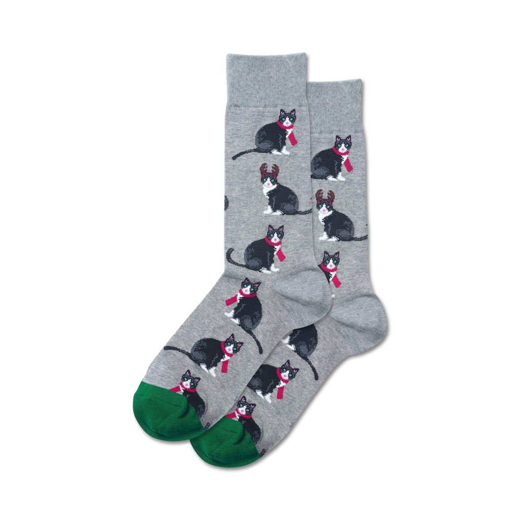 Cat-mas celebrations just got even more adorable and festive with these reindeer cat socks. They're gray with a pattern of black cats with red scarves and reindeer antlers. The socks have bright green toes and heels with a crew sock length. Look at these cats, dash through the snow in style. These Christmas-themed socks are purr-fect for the feline-loving fashionista in your life. Meow-y Christmas!