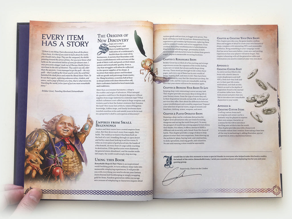 Remarkable Shops & Their Wares is the ultimate inspirational sourcebook to create and roleplay fantastical shops. A richly illustrated book, featuring eight ready-made and remarkable shops to use in any campaign world. Complete with staff NPCs, items, and exciting quest hooks. This is the sequel to our best-selling Remarkable Inns