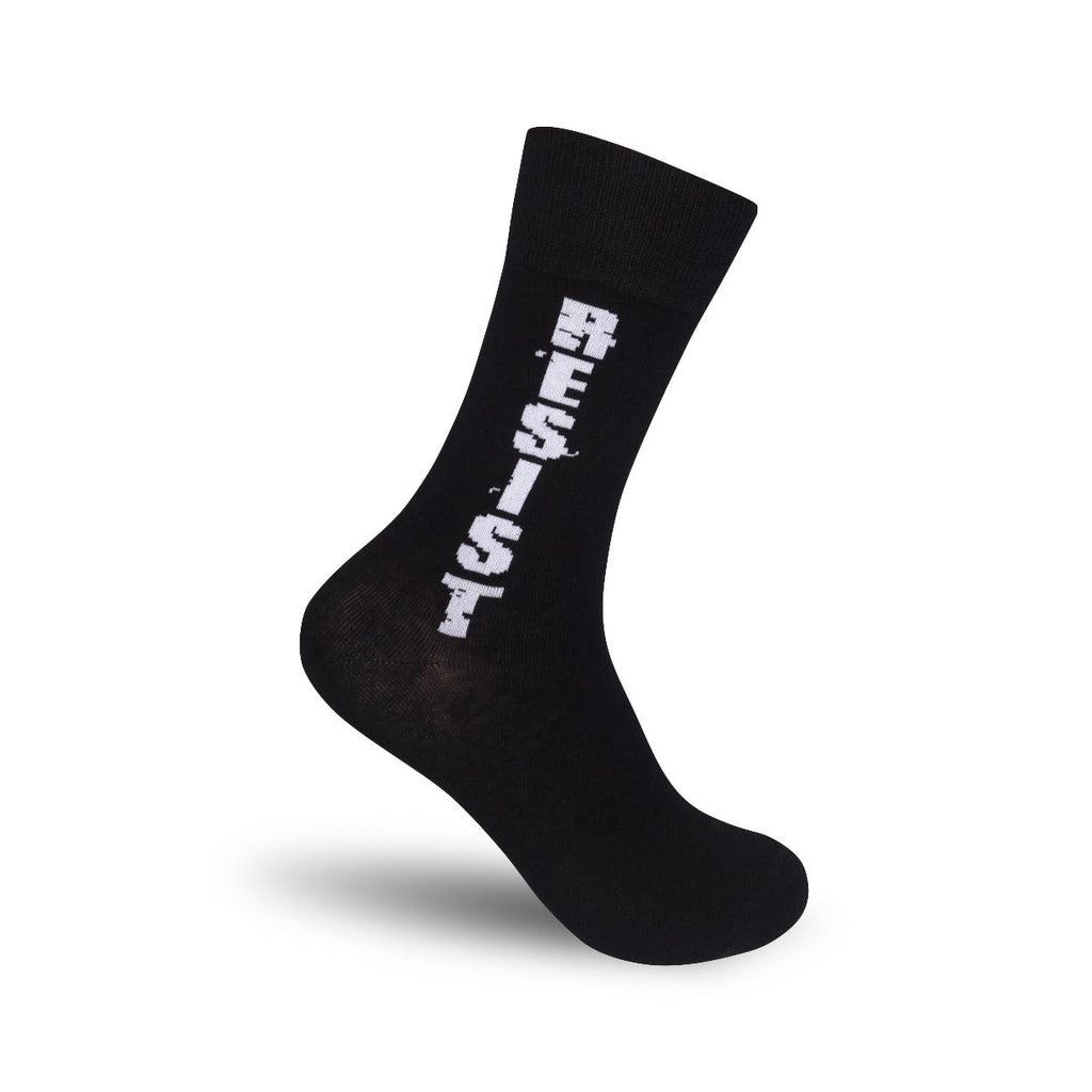 Black socks should be boring, but who said style needs to be serious? These Resist socks will speak your truth from your toes to your knees in classic black and white, blocky, capital letters that say it all: RESIST. So put on a pair and let the world know you'll never back down.