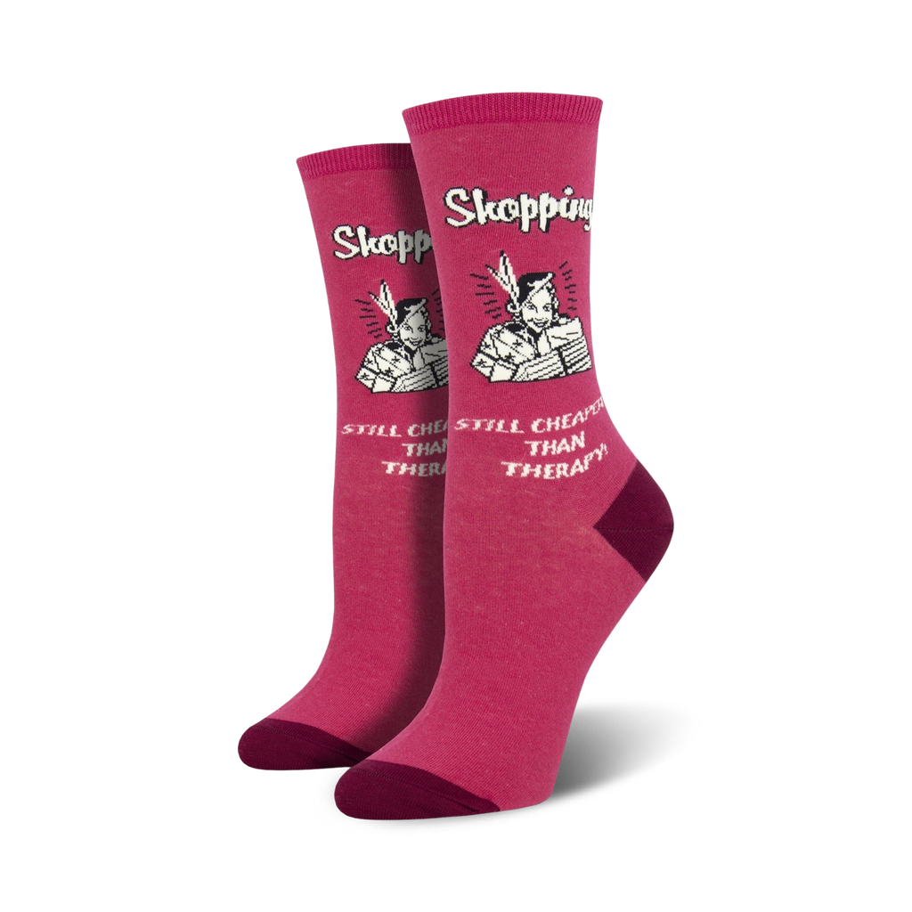 Meet 'Retail Therapy', the novelty socks that remind you shopping is self care! With a cute cartoon lady loaded with shopping bags and the phrase, "Shopping... Still Cheaper Than Therapy" you'll strut the aisles in fashion and humor. And, psst... it's cheaper than therapy!