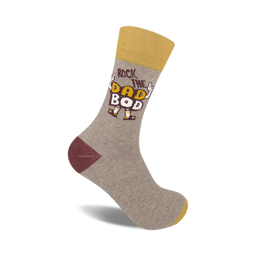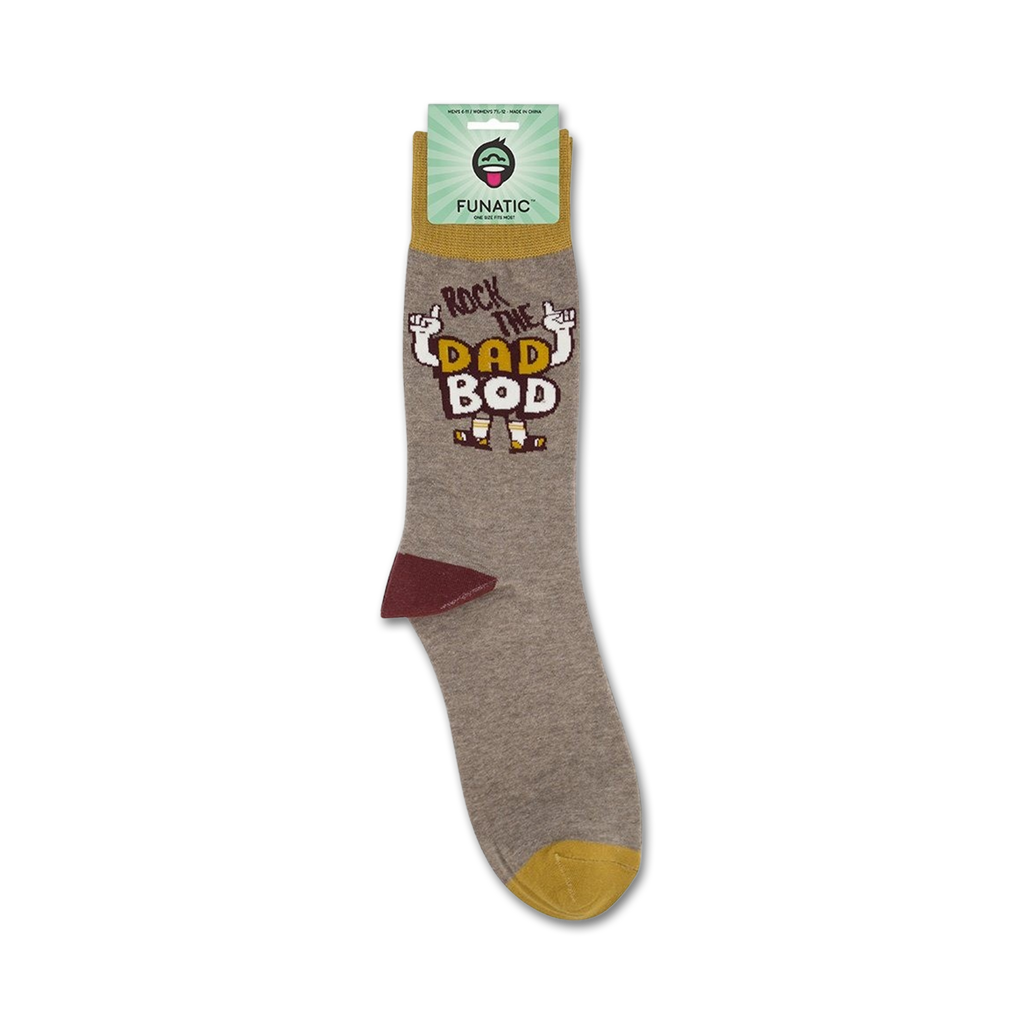 These gray Rock The Dad Bod men's crew socks are perfect for Father's Day. With brown toes and heels, yellow tops, and a cartoon of a dad with a beer belly and mustache, they're sure to make him smile. They also have the words "Rock The Dad Bod" on them, so he can show off his pride.