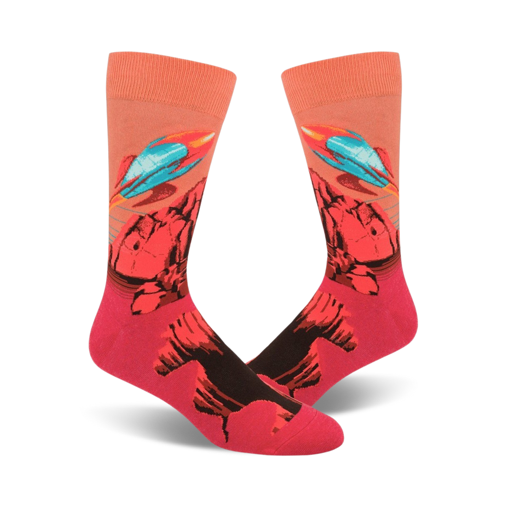 Channel your inner Buzz Lightyear and prepare for sock-sational adventures with our "Rocket from the Red Planet" socks. These red and orange rockets are boldly soaring through space amidst black and white geometric shapes, leaving you ready to boldly go where no feet have gone before! Blast off with a sock-sational journey today!