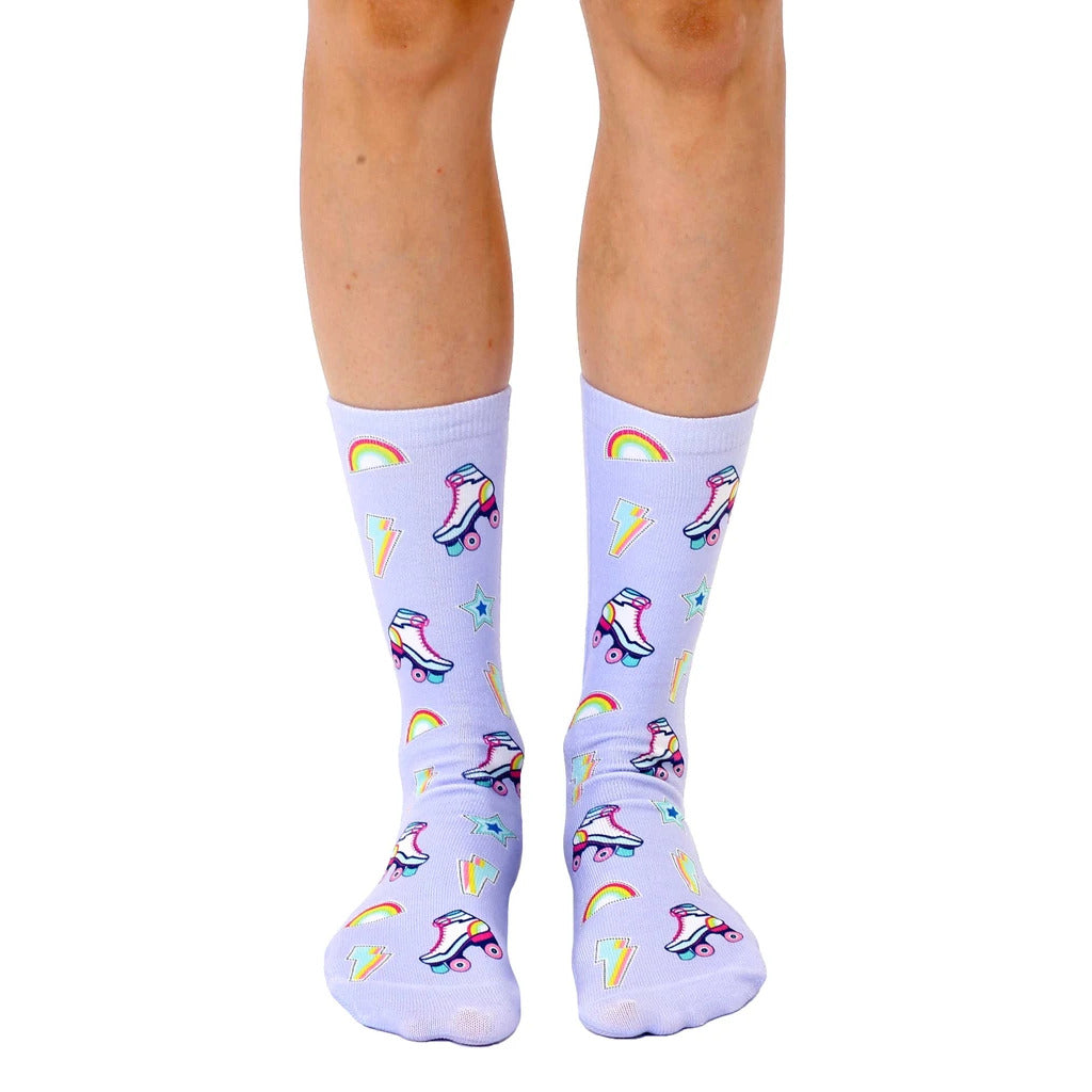 Groove to the beat with our electrifying Roller Skate socks, the perfect accessory for your favorite pastime. These socks are a burst of fun with a vibrant lavender background and a tantalizing pattern of rainbows, lightning bolts, stars, and roller skates. Like the ubiquitous roller skate key, these socks will unlock the door to your inner child, reminding you that life is a joyful adventure on eight wheels. Embrace your passions and let your feet tell your story of boundless enthusiasm!