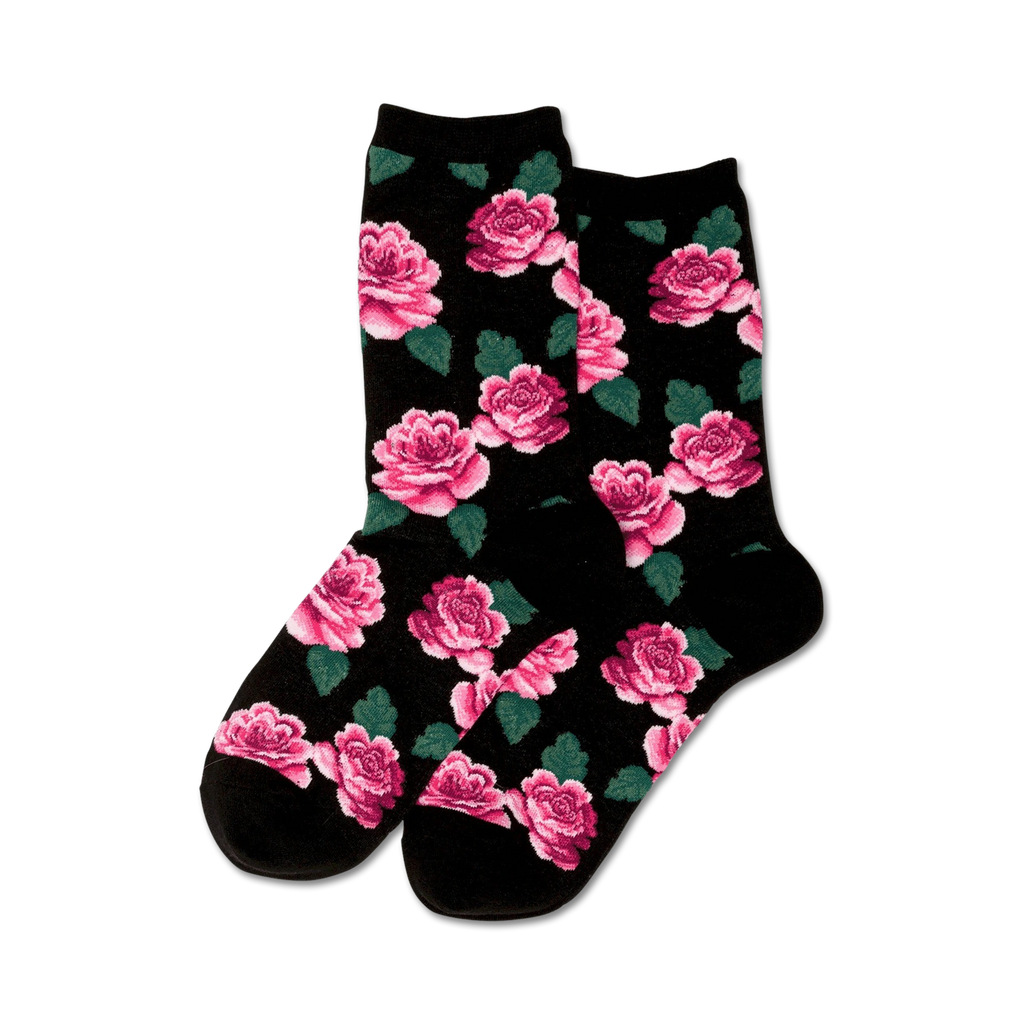 Say hello to Rose Print socks! These classy crew socks are designed for the modern woman who wants to make a statement without saying a word. With a vibrant pattern of pink roses and green leaves on a black background, these socks will add a splash of color to any outfit. Whether you're rocking sneakers or heels, these socks will make sure you're the center of attention. Plus, they're made with high-quality materials that will keep your feet cozy all day long.