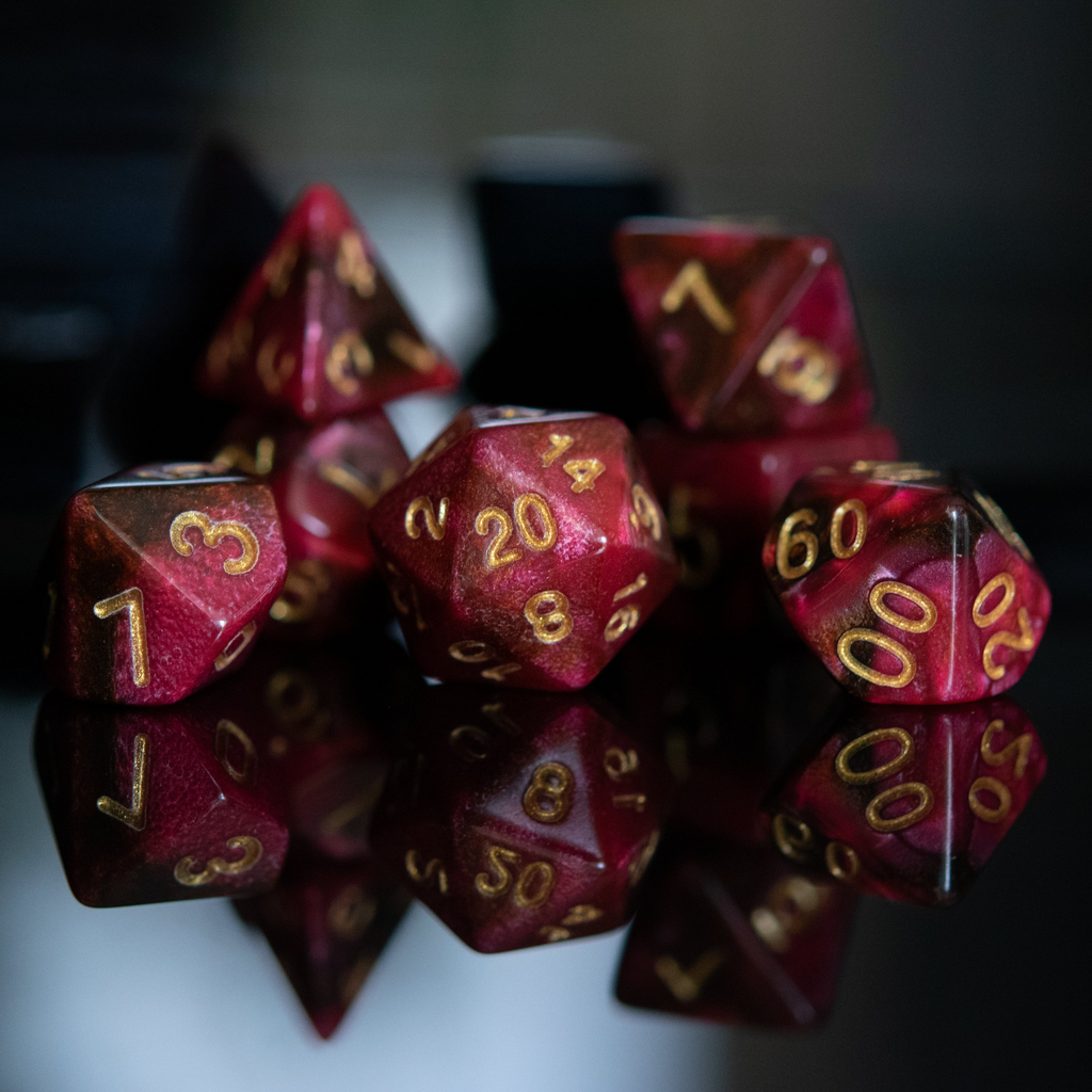 Our acrylic dice are carefully poured into individual molds and cured inside a vacuum chamber to insure no air bubbles are trapped inside the dice. After curing, each individual die is removed from the mold and numbers are painted by hand. These dice are perfect for any RPG and will sure to impress at your upcoming session!
