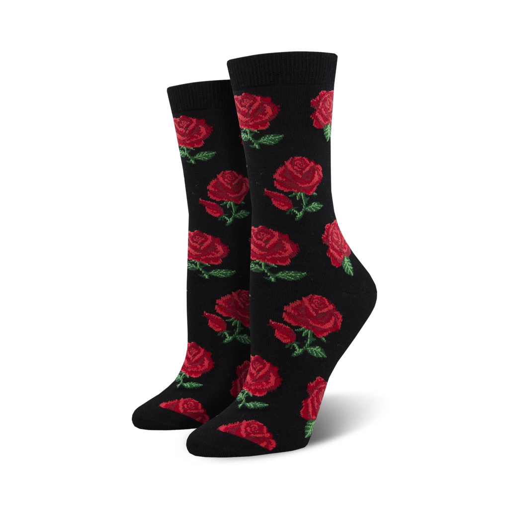 Strut your stuff in our Rosy Toes Bamboo Crew Socks! These garden-fresh beauties feature a delightful pattern of delicate red roses with lush green leaves, designed to add a splash of nature's charm to your everyday wardrobe. Perfect for the rose-lover with a hint of edge, these socks will be sure to turn heads with their stylish and unique design. Just like roses, these socks are also known for their soft, thorny feel so you can be comfy and cute all day long.