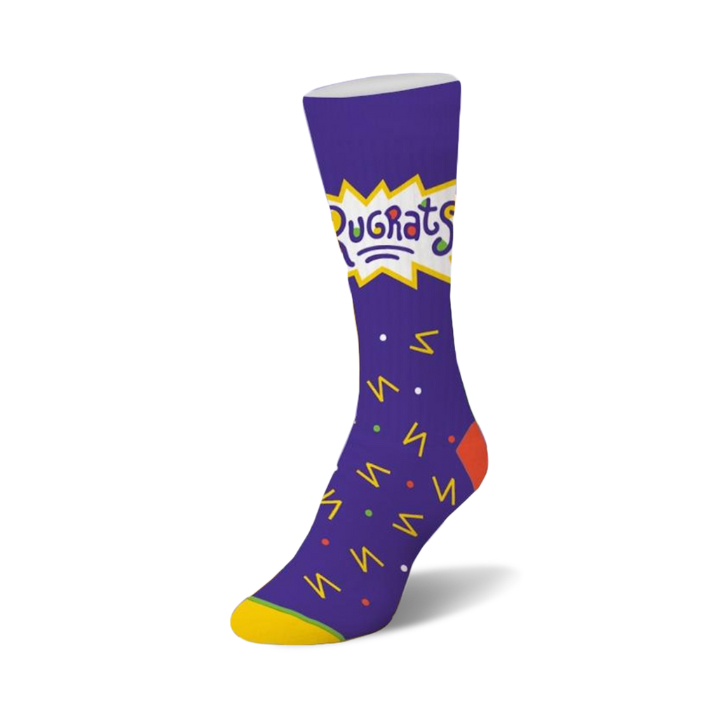 Rugrats Confetti: The socks are our piece de resistance sure to leave even Angelica Pickles green with envy. They've got purple feet and heels and colorful Reptar-themed shapes and characters all over them. Chuckie, Tommy, Dil, and Angelica are there to keep your feet company, wherever you're headed. It's time to get your Rugrats on!
