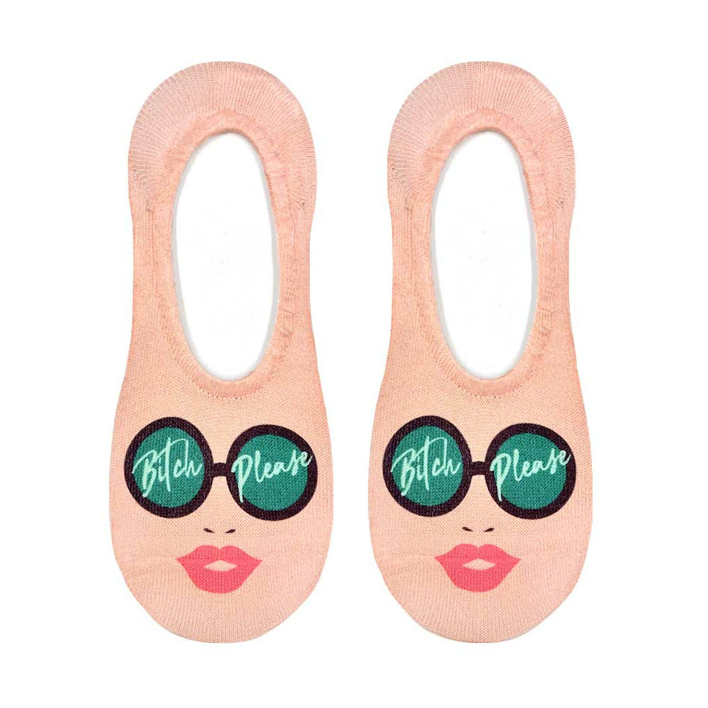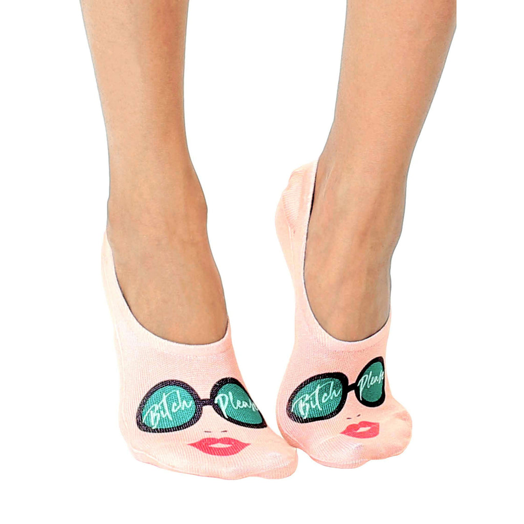 Sassy sunglasses, sassy socks! These pink socks are covered in black sunglasses with a pink outline and the text 'Bitch Please' written on the lenses. The pink heel and toe add a touch of sass too. Perfect for channeling your inner diva, these socks are sure to make a statement wherever you go! A fun and funny accessory that will add a touch of sass to any outfit. These socks are perfect for making a statement or just adding a bit of fun to your everyday look.