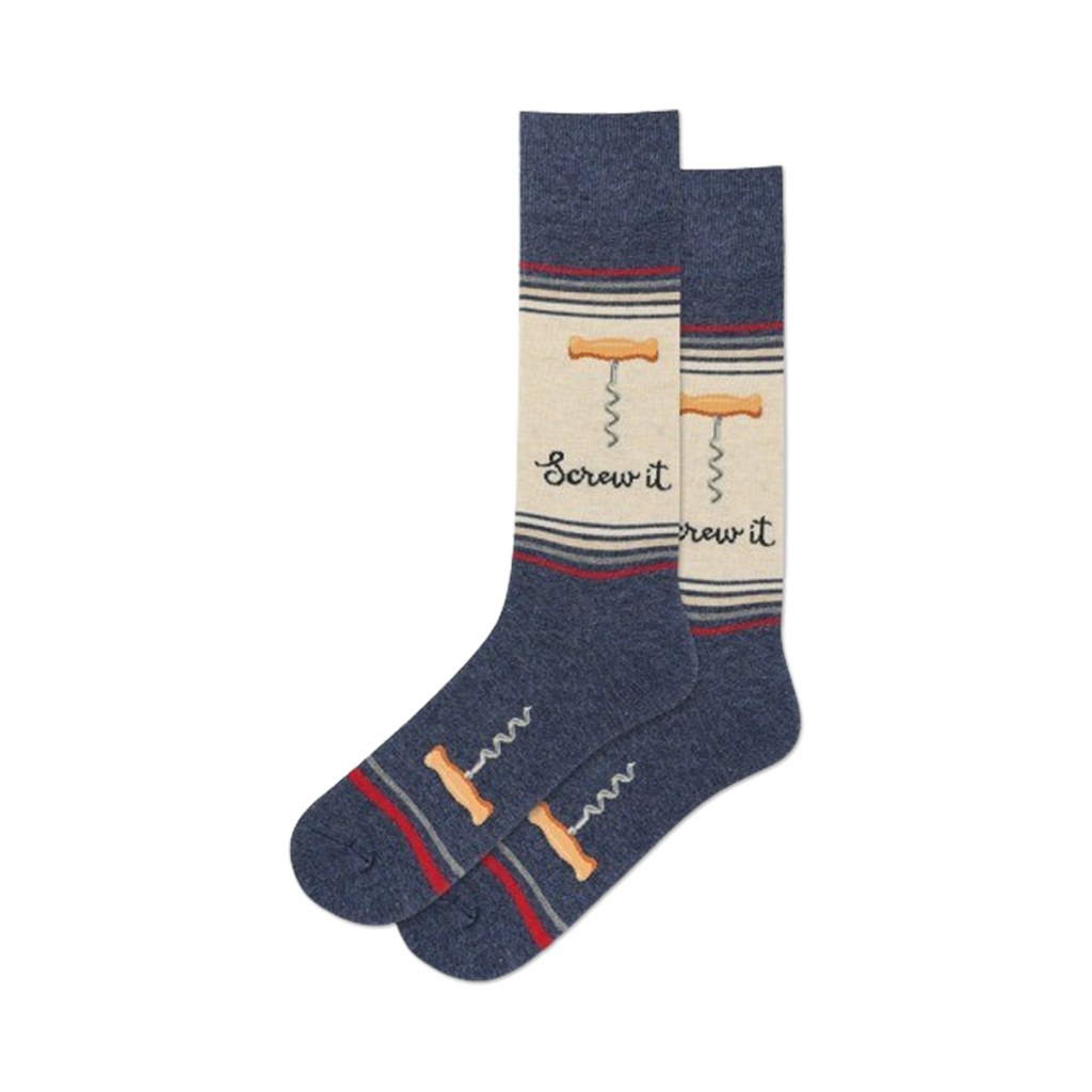 Life's too short to be serious all the time. Pop on a pair of these Screw It socks, featuring a vivid blue background with a corkscrew design and the perfect sentiment for when you need a reminder to lighten up. Because hey, sometimes the best way to cope is to just say "Screw It".