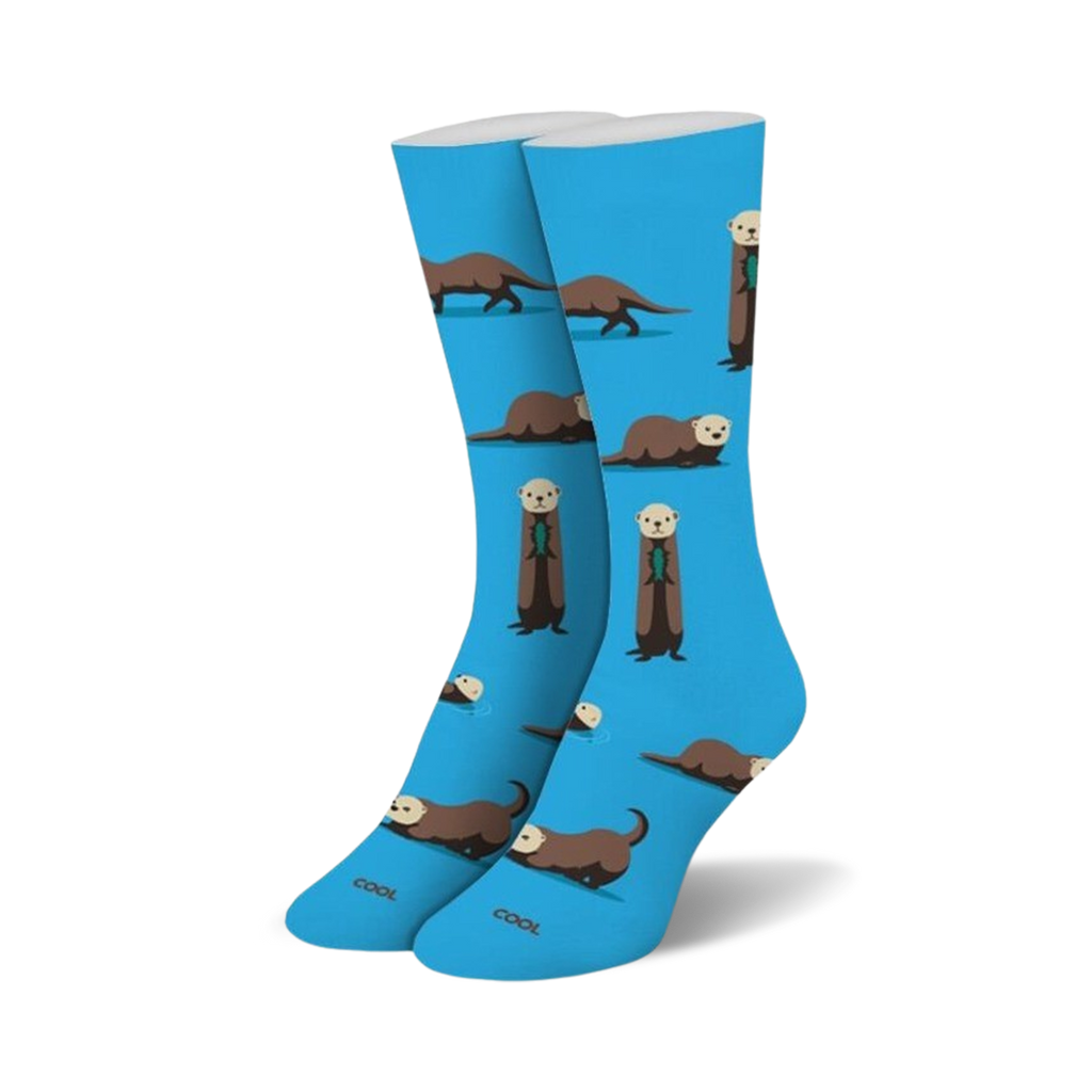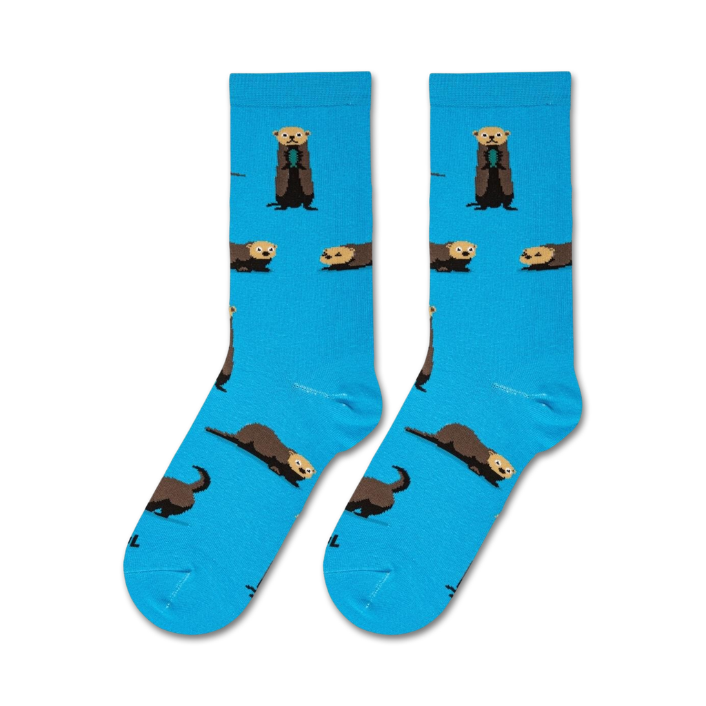 Sea otters are known to hold hands while they sleep to keep from drifting apart. Now you too can drift into slumber clutching a cartoon sea otter on your feet! Our Sea Otter Crew Socks are as playful and energetic as the animal that inspired them. These socks are blue and covered in cartoon sea otters holding fish. They're the perfect way to add a touch of fun to your wardrobe and brighten up the day of that special sea otter lover in your life.