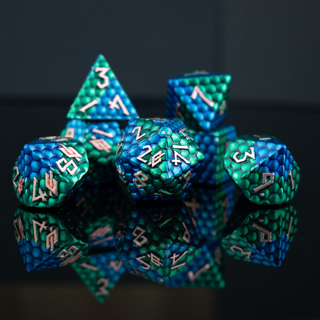 Our metal dice sets are all cast from zinc alloy metal to assure better balanced rolls. This set is perfect for any RPG and will be sure to impress at your upcoming session! Every set comes with its own metal dice tin or velvet dice bag.