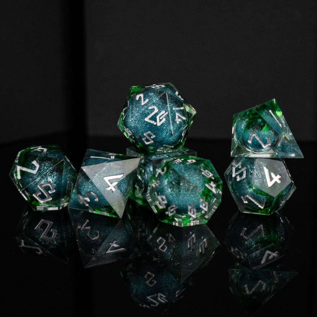 These dice are resin dice are cast with a mesmerizing liquid center! Shake up the dice to witness a beautiful combination of deep colored glitter swirls. The unique structure of these dice do not affect the roll of the die.