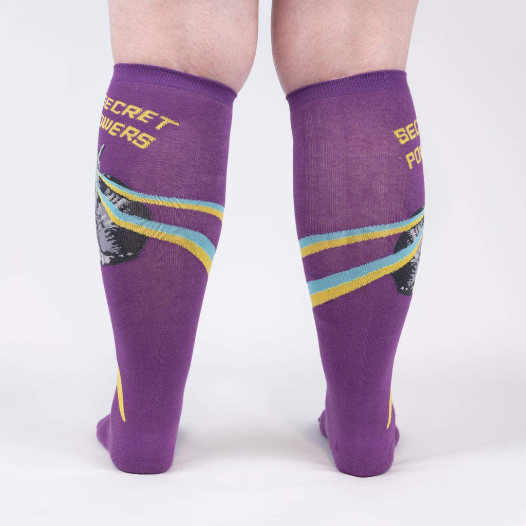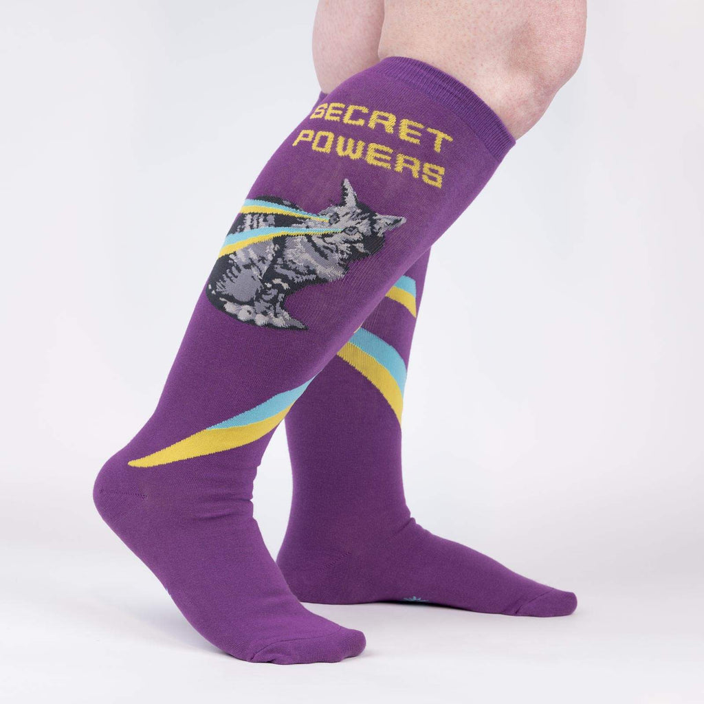 Cat's got your tongue? If not, prepare to be charmed off it with these Secret Powers knee high socks! The purple base of these funky felines will turn your legs into a magical mystery, and the mystical one-eyed cat with rainbow lasers will strike awe into the hearts of your enemies. Meow!