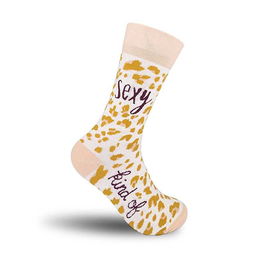 Say hello to purrfection with these sassy socks featuring sexy leopard spots and the words "Sexy... Kind of." White with pink toe, heel and cuff, these socks capture the essence of a sassy femme fatale, reminding everyone who wears them that they're fierce and fabulous. Meow!