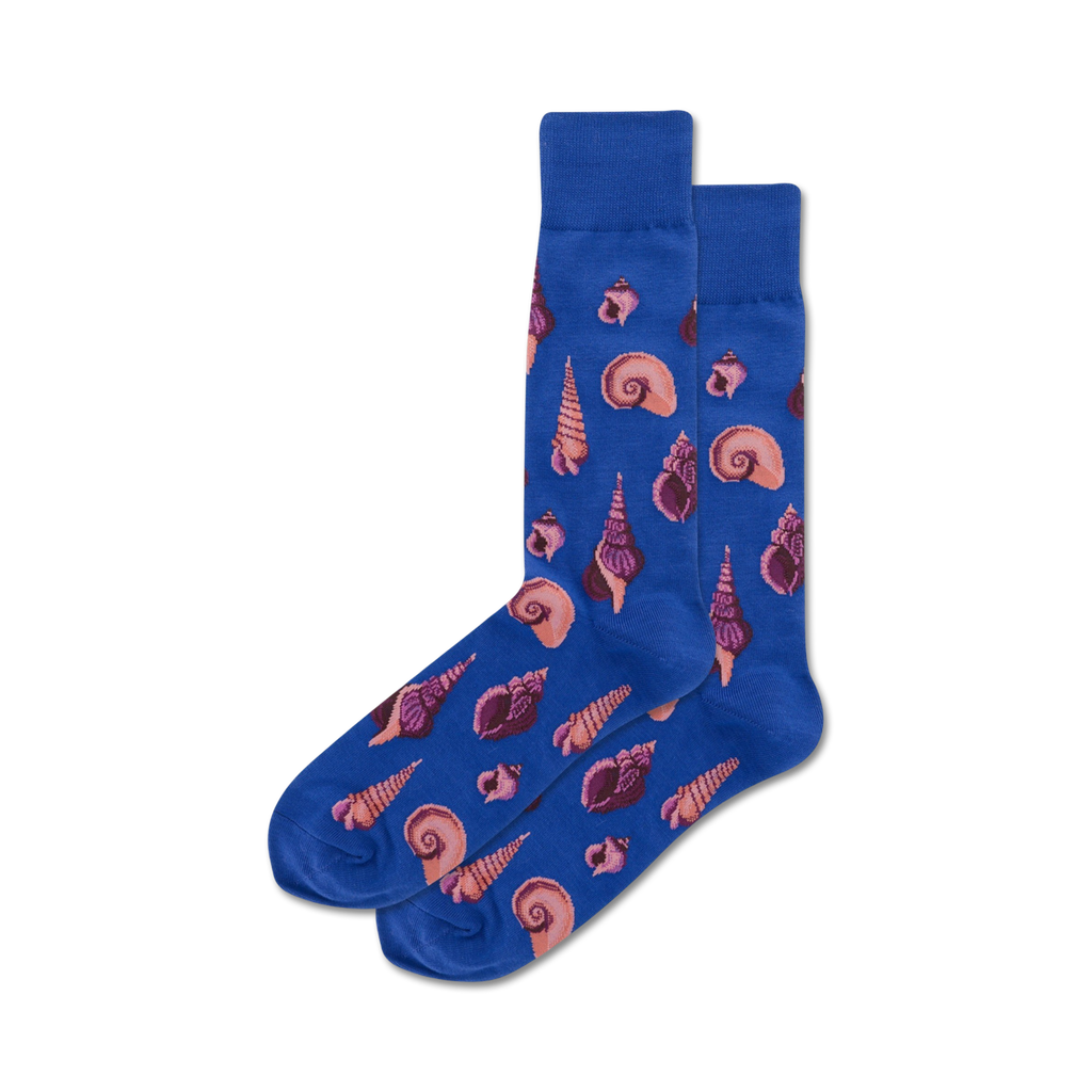 Seashells. A classic beach item but worn on your feet! Feel the warmth of the beach everyday by wearing our cozy crew-length socks that feature a blue background with a pattern of seashells in bright pink and purple. Slip in these unique and comfortable socks and escape to the beach any day!