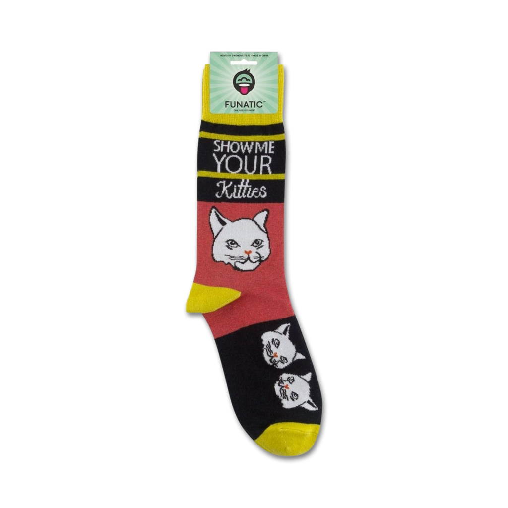 These yellow, red, black, and white socks with the words 'SHOW ME YOUR KITTIES' emblazoned across the top and three cartoon cats adorning the foot are purr-fect for any cat lover. Whether you're a crazy cat lady or just think kittens are the cat's meow, these socks will make you smile every time you put them on. They're also a great conversation starter, so you can show off your love of cats wherever you go!