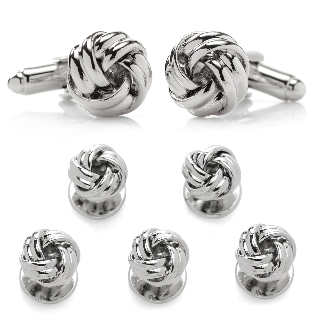 A classic knot design with an elegant silver tone finish, the Silver Knot Stud Set features a pair of cufflinks and matching tuxedo studs that are the perfect accessories for formal events. A popular item for weddings year-round, keep the groom and his groomsmen looking sharp on your big day. Pair with a black bow tie for an elegantly classic look that never goes out of style.