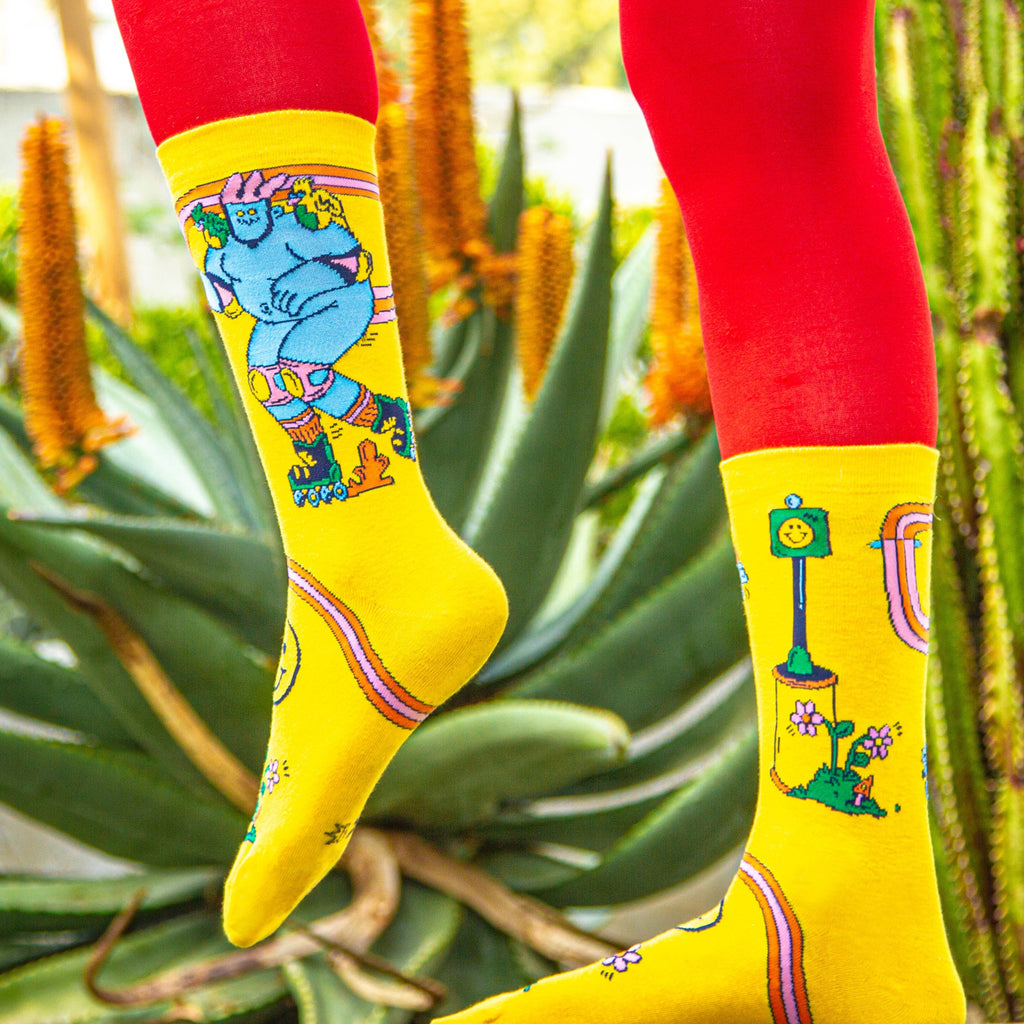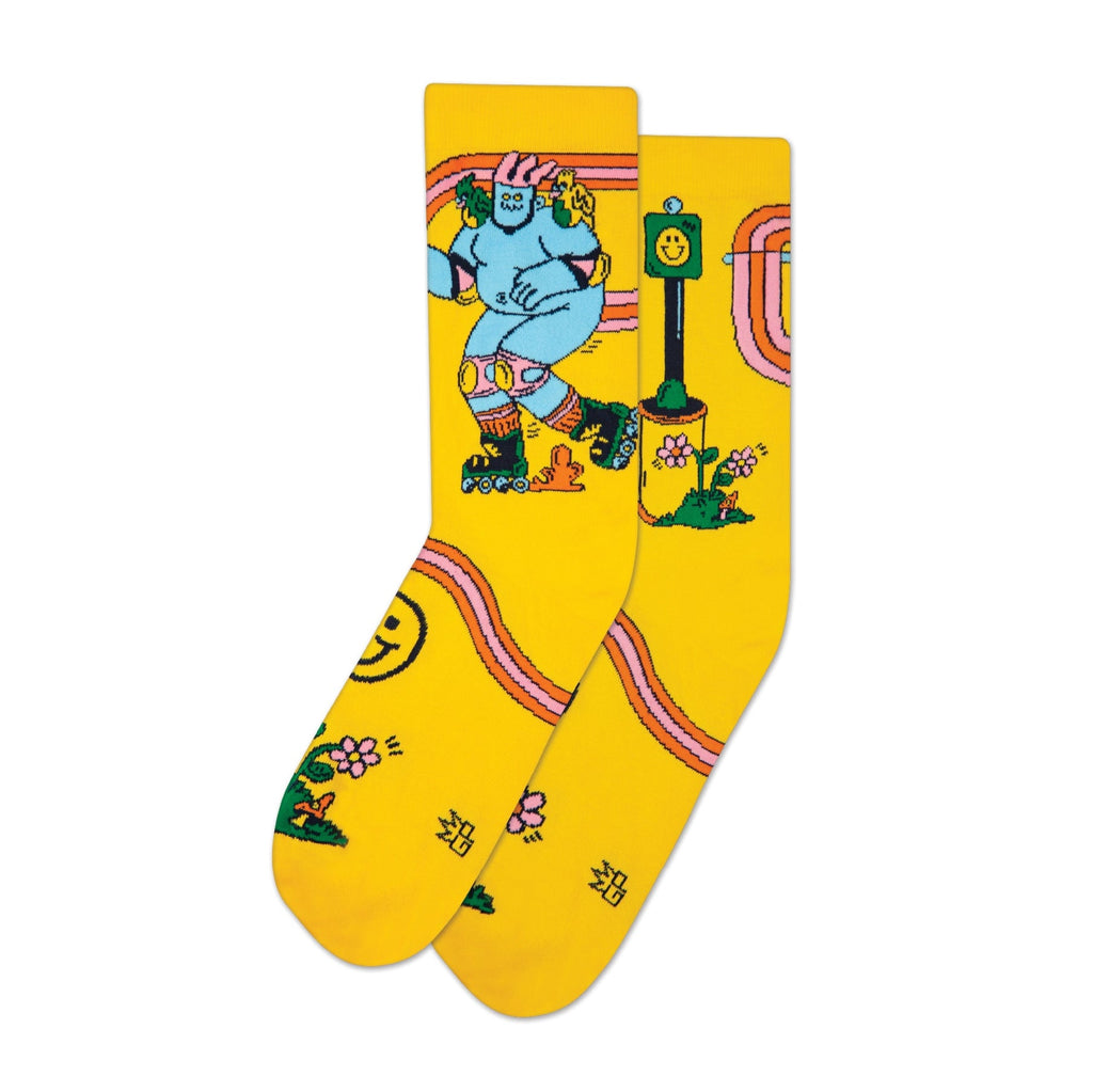 Roll into fun with our Skate Day socks! These bright yellow crew socks feature a whimsical illustration of a friendly blue creature roller skating past a smiley-face traffic light and some happy flowers. The visible design is a mix of bold lines and retro colors. They're comfy, they're cheerful, and they're perfect for showing off your playful side - whether you're actually skating or just wishing you were. Prepare for compliments.