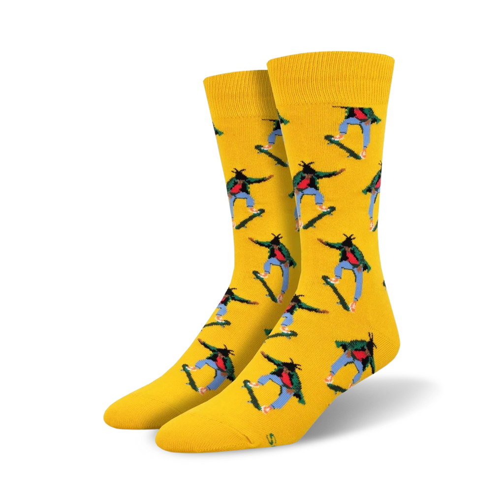 The Skate Life Crew socks will turn you into a pro skater, or at least make you look like one! They're bright yellow with a pattern of a skater dude with a sick green shirt, blue pants, red hat, and shredding a rad red and yellow skateboard. Show off your love for skateboarding with these fun socks!